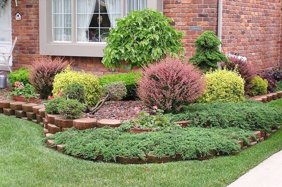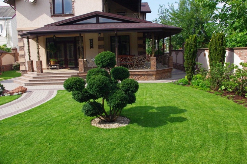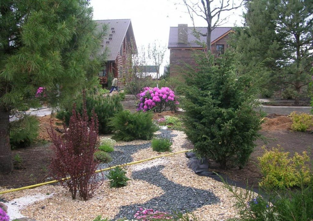 In the front part, it is customary to plant decorative shrubs, conifers. They are located in such a way that the plantings do not interfere with the penetration of sunlight into the windows of the house. Symmetrically planted spruce or fir can frame the entrance to the garden, and textured boulders will complement the composition.