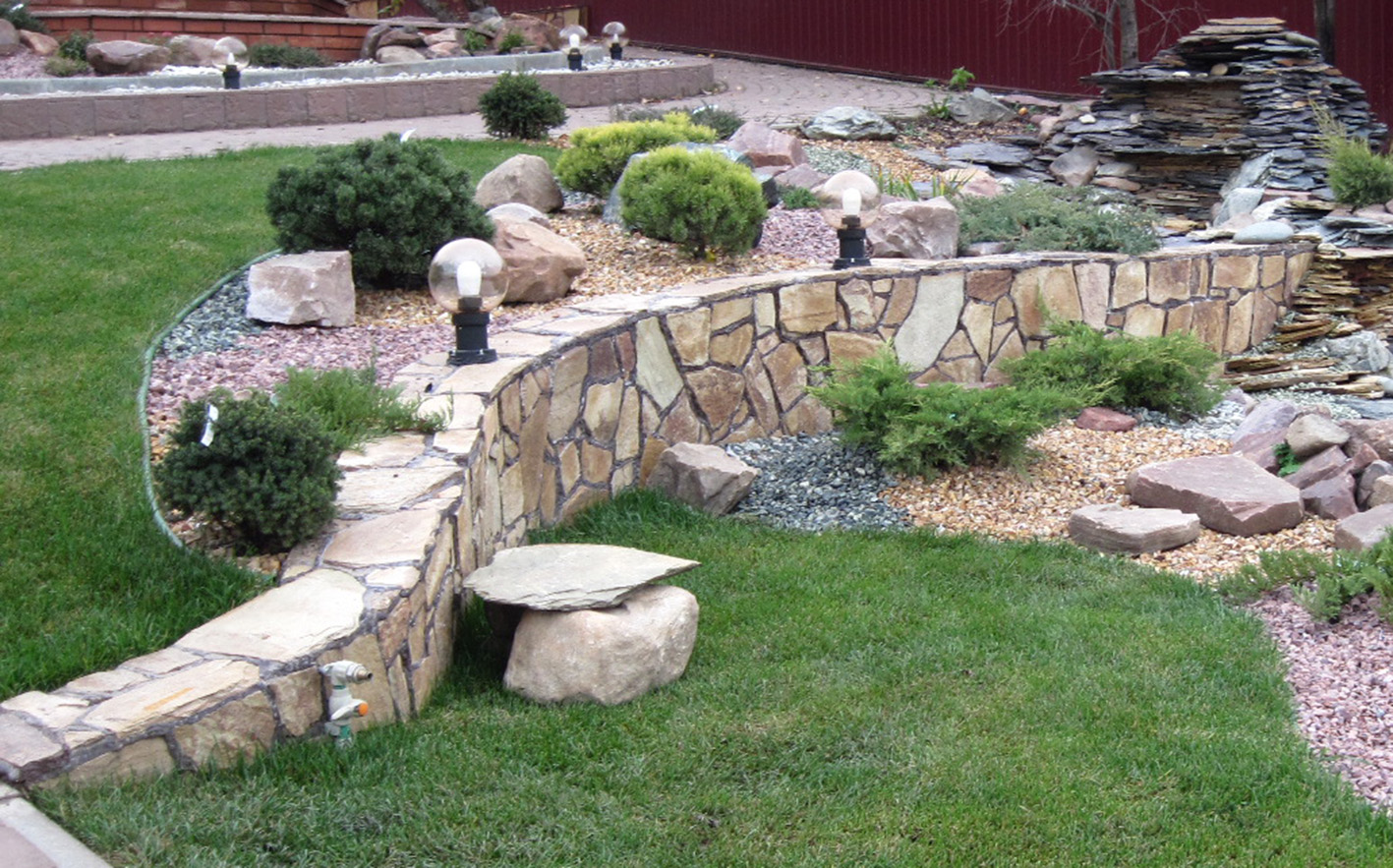 We take a natural territory limited by a certain size, the appearance of which we form, taking into account the characteristic features of the relief, available landings, and soil quality. In gardens, which are located on a sloping terrain, large stones, boulders imitating a rocky surface are built into the slope. Curly perennials with a powerful root system are planted.