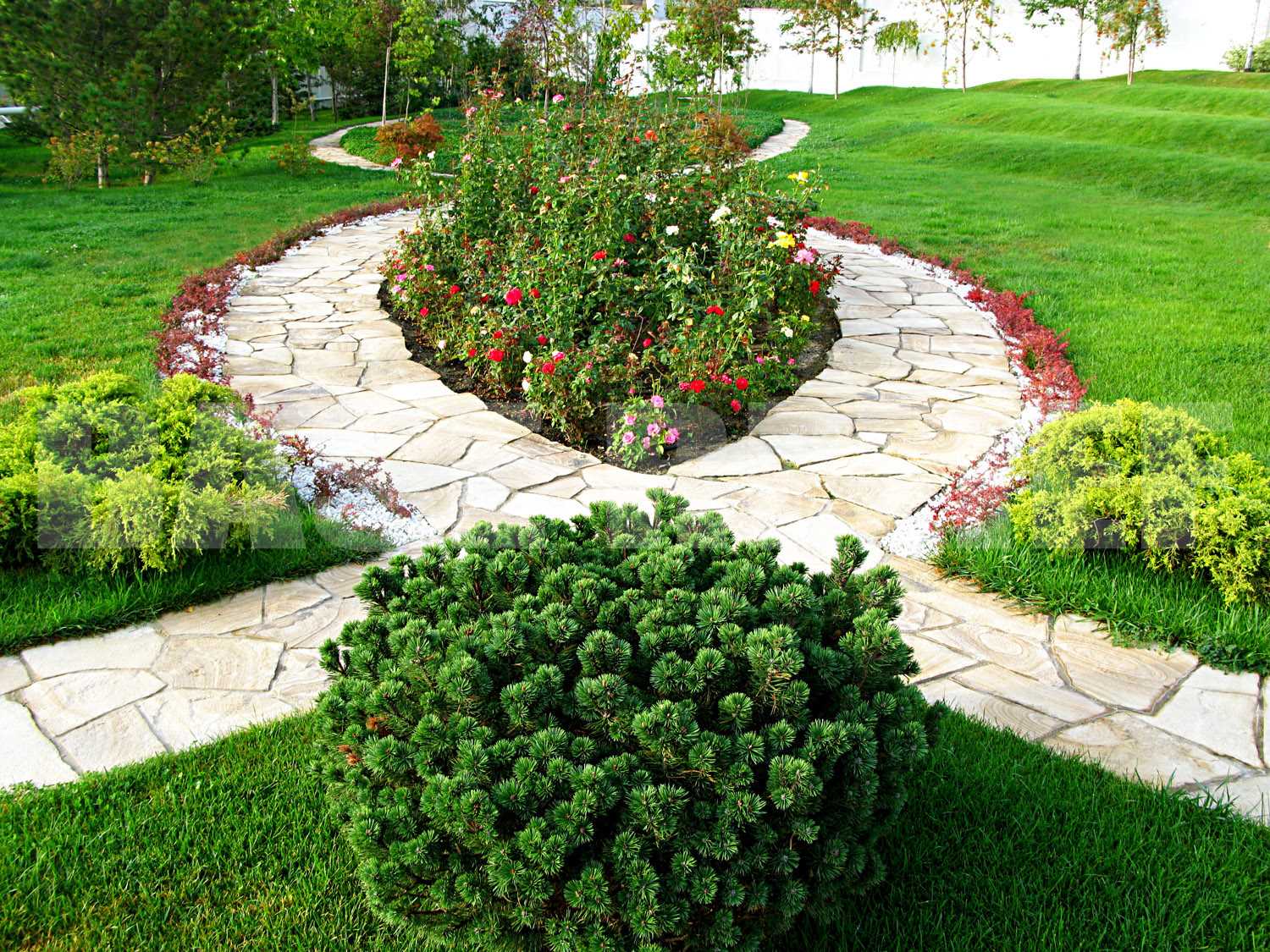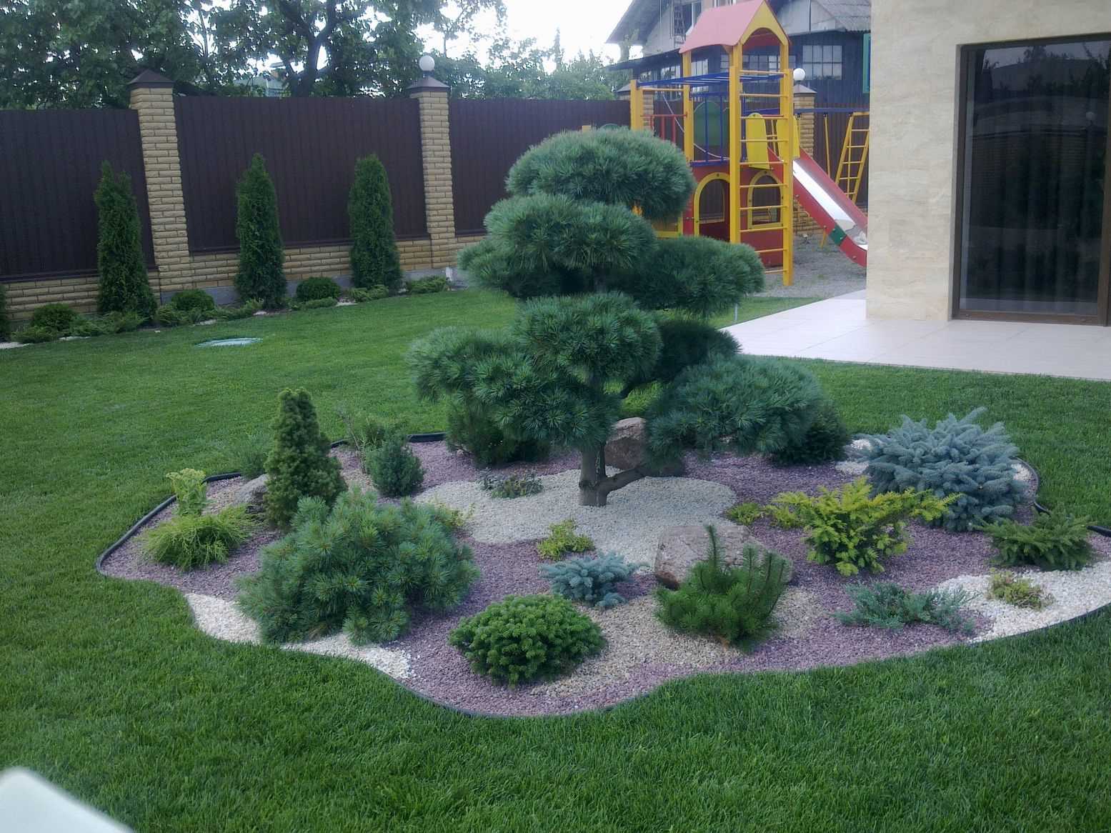 In garden design should be only real plants and flowers. Artificial are not welcome. Zones and elements are thought out and interconnected. Exotic plants should not be in the same zone. It is better to place them throughout the site.