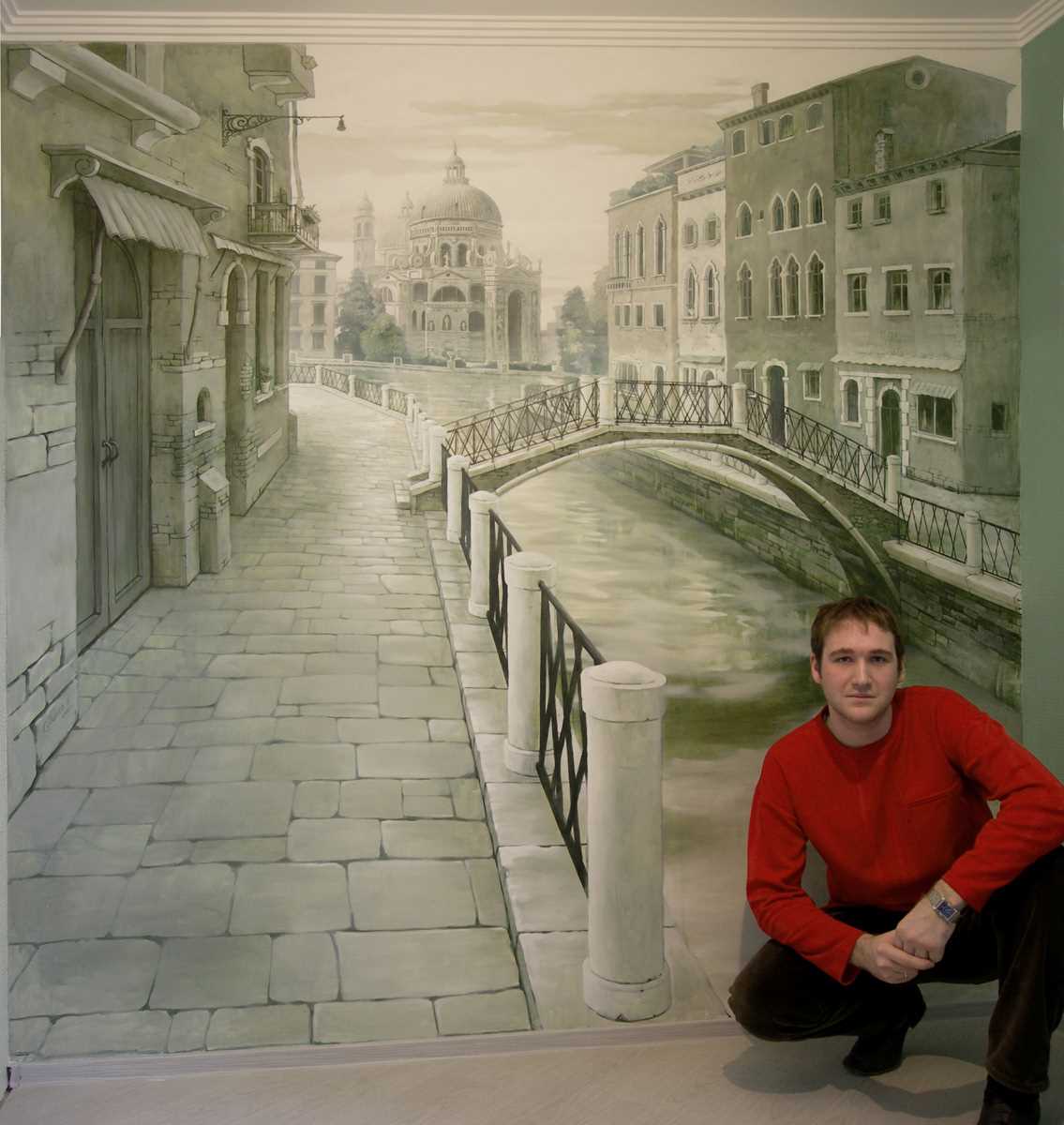You should not undertake complex murals, where the technique of shadow transitions or drawing draperies is supposed. Use a simple wall picture. There are well-known optical illusions or 3D drawings that, when accurately repeated on the walls of the apartment, will look just as impressive. For example, a staircase leading to a snowy street with lanterns along the alley, or a painted descent into the quarters of a metropolis. But you never know how interesting and accessible to implement ideas ?!