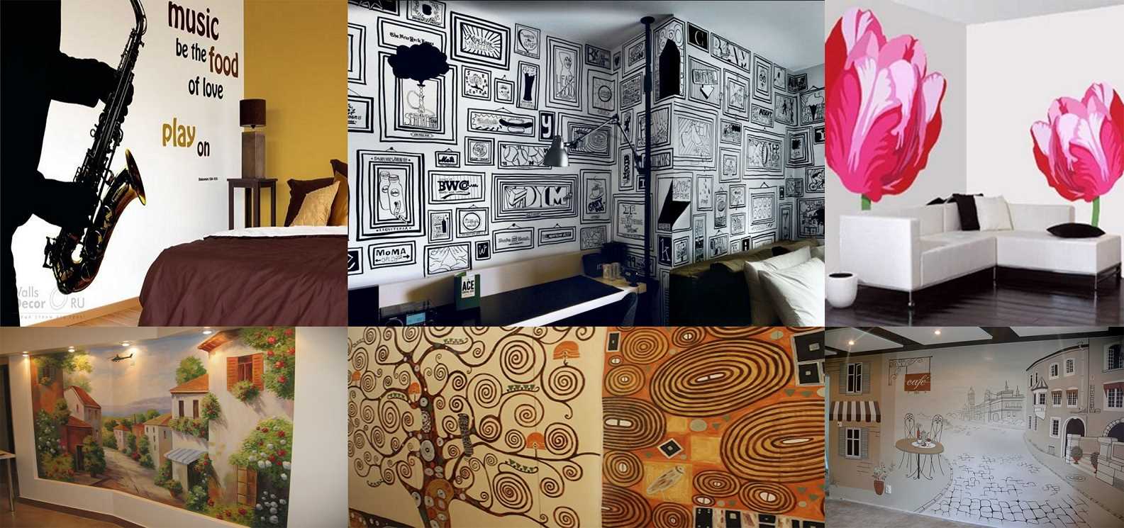 The easiest way to do it yourself, without involving an artist, is to redraw black and white images of portraits of John Lennon or Victor Tsoi, which have long been familiar to everyone. Girls draw Merlin Monroe and Coco Chanel against the backdrop of the Eiffel Tower. It is easier to draw a conditionally-shaped drawing of a lady in a hat in her bedroom. It’s a little more difficult to transfer your silhouette profile into small squares from a good photo and fill in the necessary areas with paint. After practicing with drafts on a piece of plywood, they make clean drawings on the walls in the interior, as in the photo.