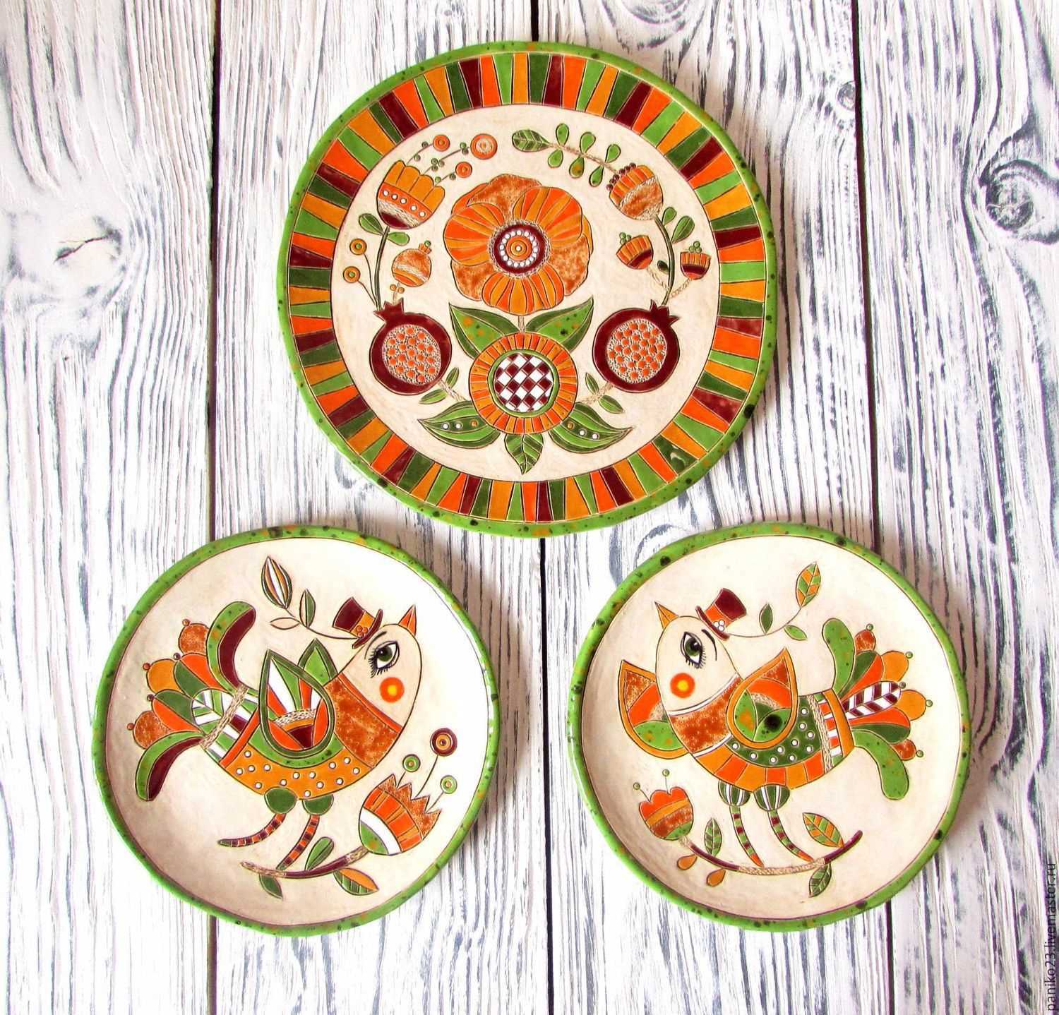 Painting plates is a rather complicated, but fascinating task. Any plot drawn is allowed, it all depends on the general interior of the house. Landscapes, ornaments, fairy-tale or mythical plots, flower arrangements, animals and birds, painting under Gzhel or Khokhloma look great on decorative plates.