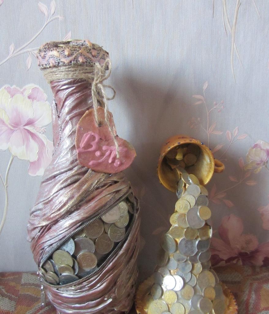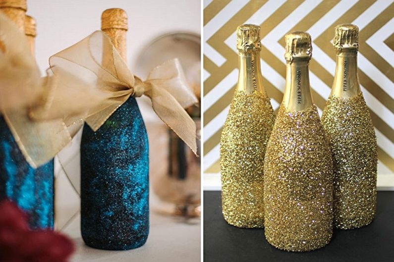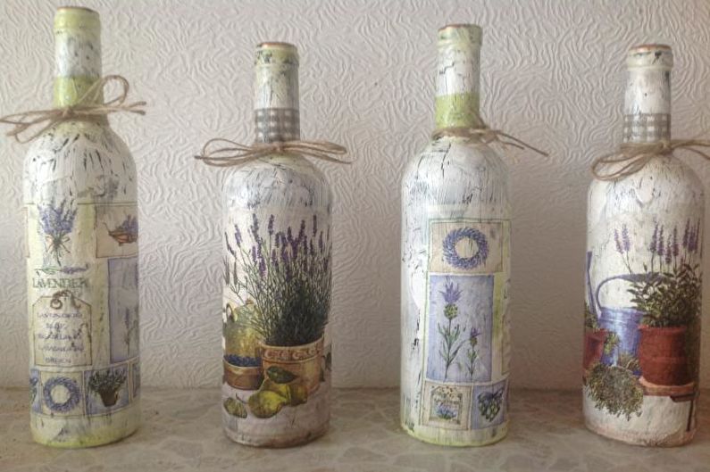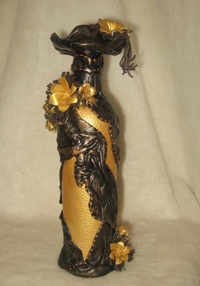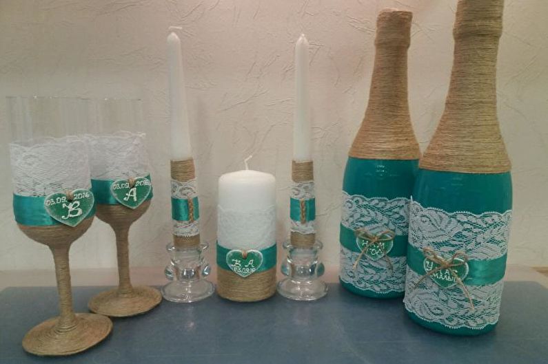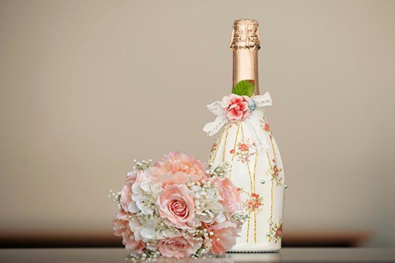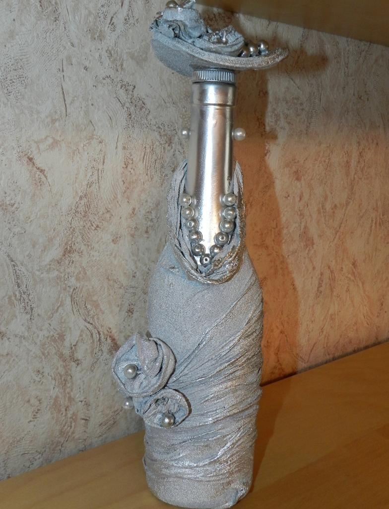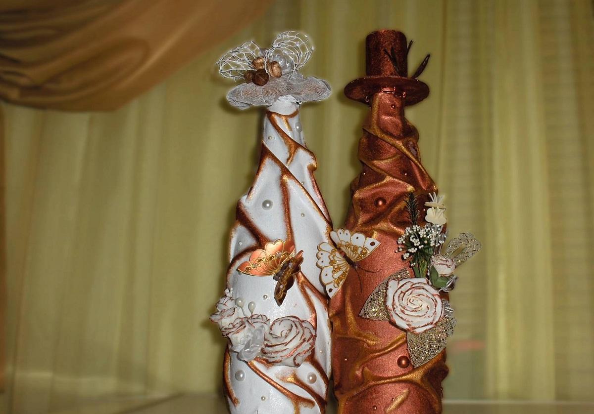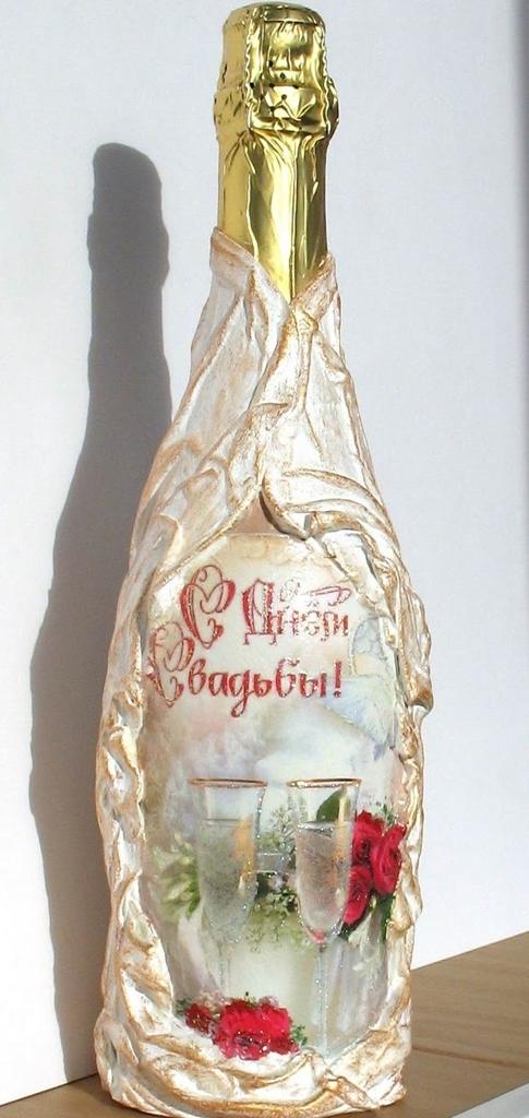 Decoupage of bottles with tights for wedding decor is a simple and quick option. The essence of the work remains the same as described above. Preparation is carried out on the same principle.