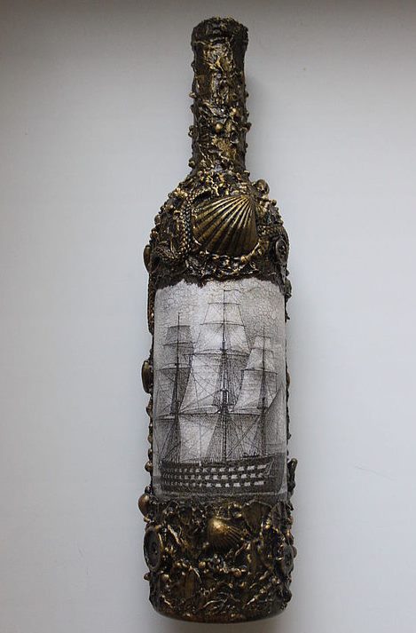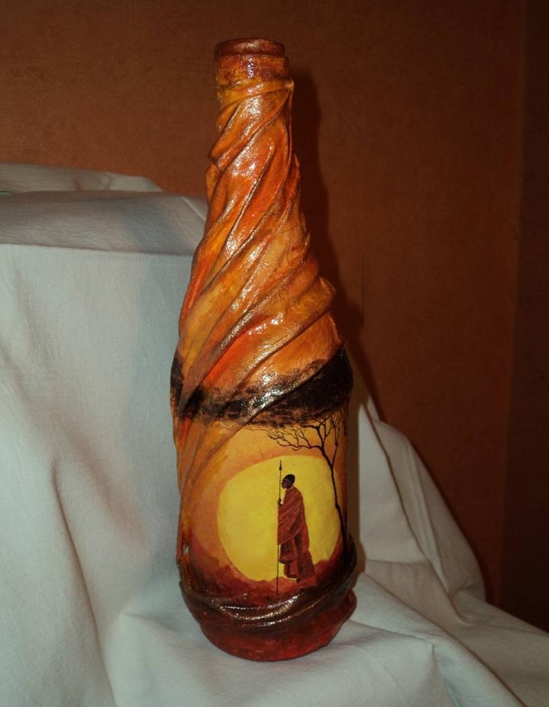 - We make a drapery. Soak the tights well with glue diluted with water. Apply capron to the bottle horizontally or diagonally, creating various folds. The fabric can be positioned in any direction. The main thing is to create beautiful folds. It is also important that they are well saturated with glue and well set. Upon completion of the volumetric design, allow the product to dry, leaving it for a day in a warm, dry place.