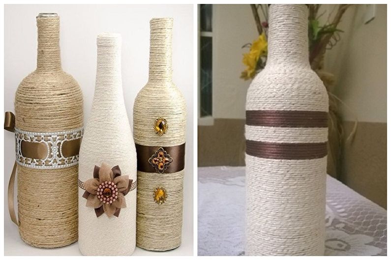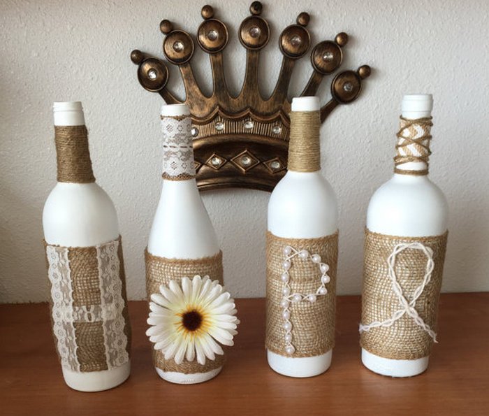 An ordinary glass bottle decorated with the help of tights can become a chic decorating element in the interior of any room