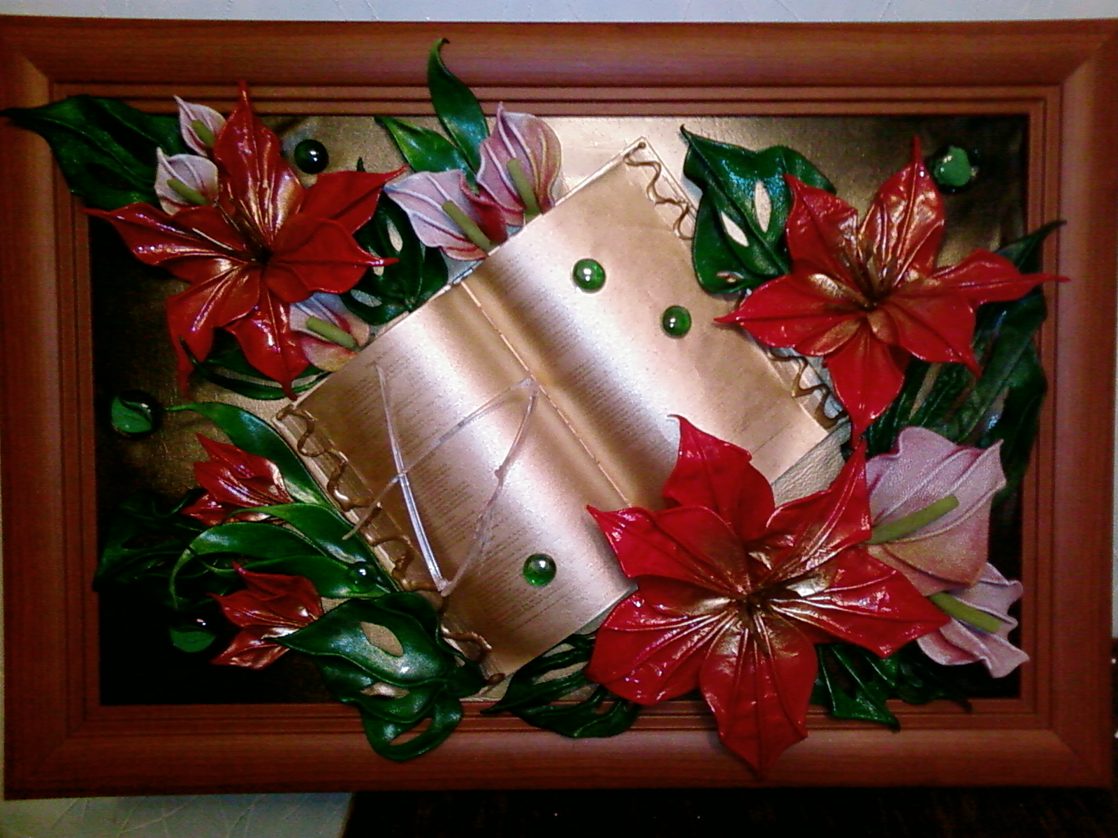 Try to make a composition of wool, for this there are already ready-made sets. To a sticky felt surface, pieces of wool of different colors are laid out alternately. The finished canvas is placed under glass.