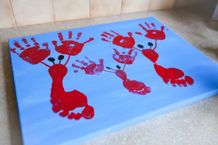 - Hand prints. Painted palms are applied to the canvas, leaving an imprint. Capture your family in this way, or the stages of growing up a child.