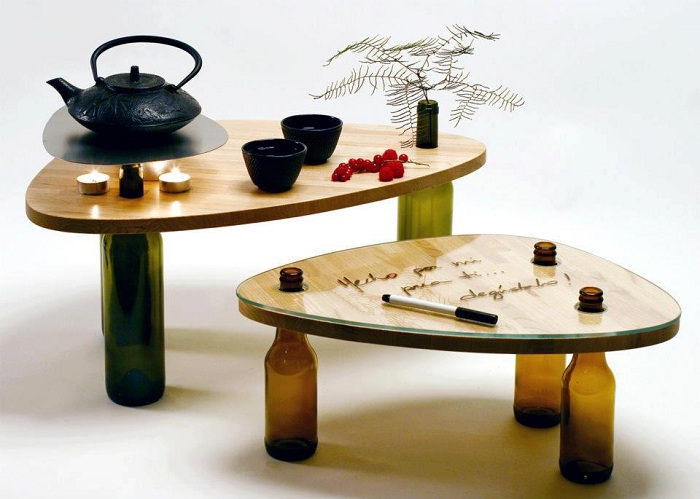 The decorative tables look amazing. It is not difficult to do them yourself. Find the old table. Restore it, and then organize the countertop in the form of a real work of art. This can be done by laying on it a sheet of light material that is resistant to moisture. The composition is laid out on top of the sheet. The same wine corks, tree branches, sea stones or large beads are suitable here. The next step will be epoxy resin casting.