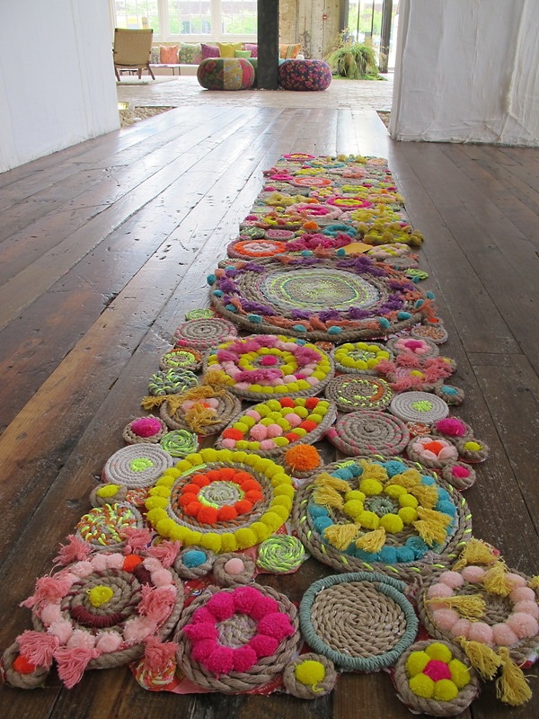 Multi-colored textiles look beautiful on the walls. Different textures of the canvas are stretched on a wooden or wire frame of a rectangular shape. It turns out a kind of patterned picture. Hang several of these items. Each shape does not have to be rectangular. Leave it to your taste.