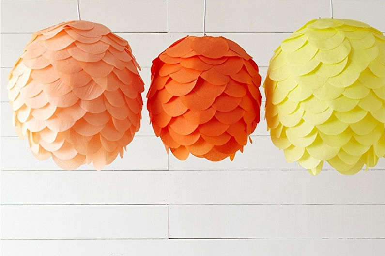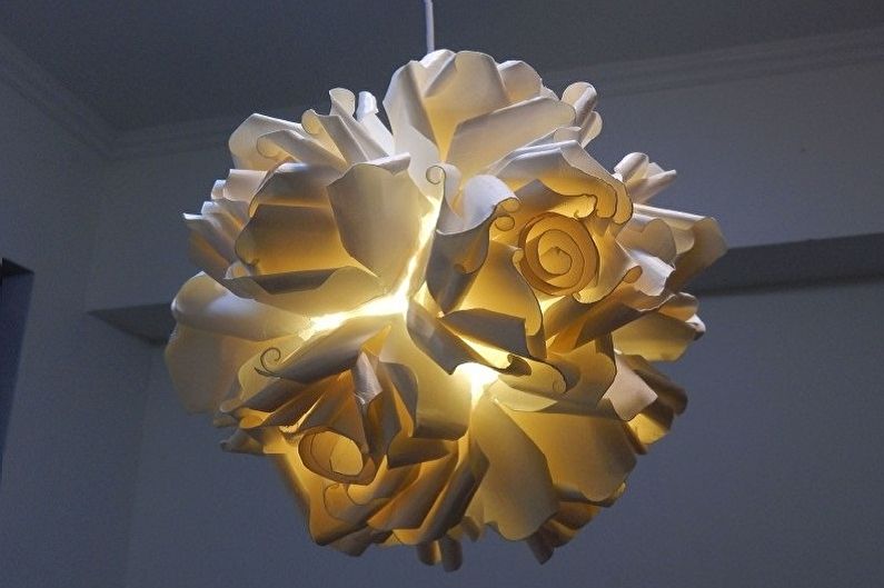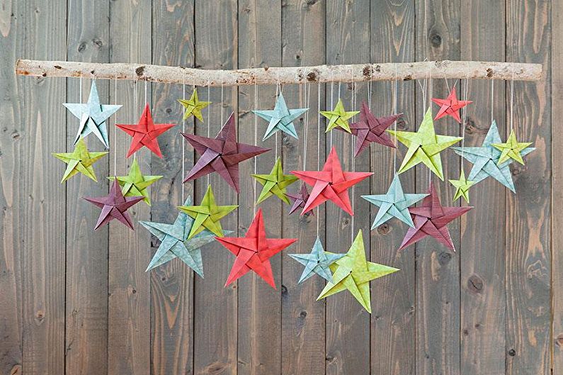 The ceiling can also be decorated with paper origami. Glued figures are hung on strings. At the same time, the composition made by the figures at different heights looks beautiful. The color scheme is varied.