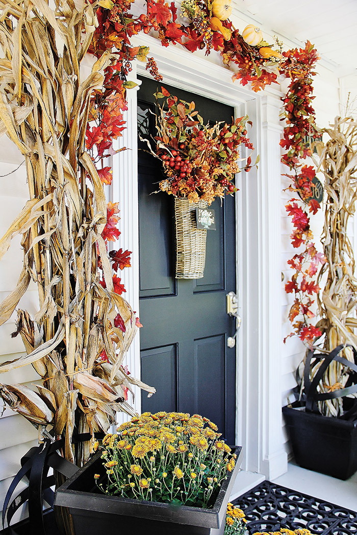 If you live in a country house, there is a great idea to design the front door to the terrace or back yard. Platbands are decorated with autumn leaves of different colors. Next, place decorative cages painted in white, inside of which can be stuffed birds or animals. Yellow garden pumpkins perfectly complement the picture.