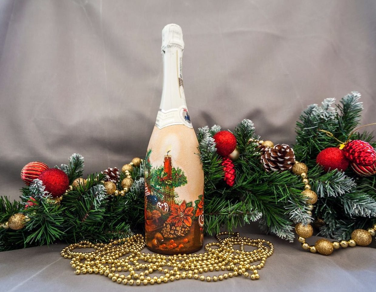 DIY Christmas decor of the bottle itself will become an appropriate element at the table. A common option is to decorate champagne with corrugated paper, securing it with satin ribbons in color.