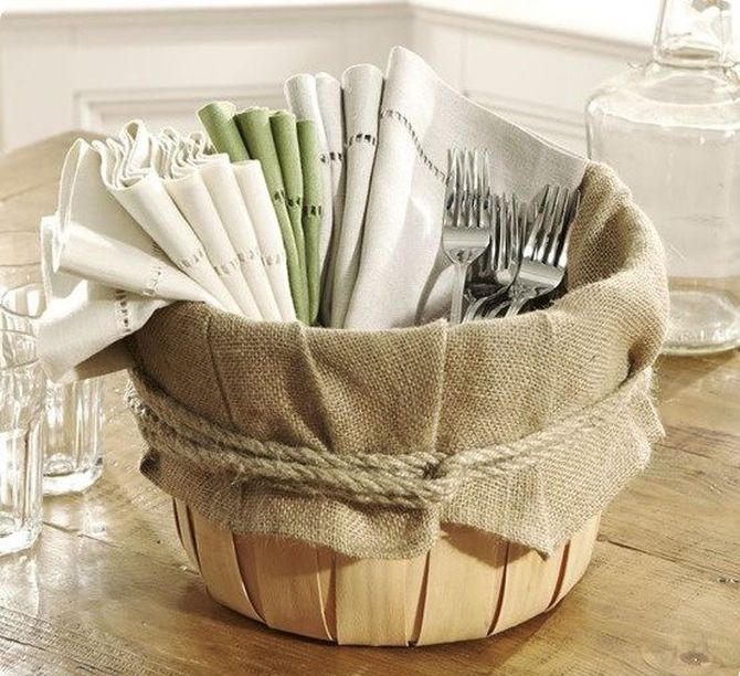 Accessories for dishes or candles is a thin strip of burlap wrapped around an item and fixed with hot silicone glue. As you can see, burlap in the interior with your own hands is easy. Making accessories does not require any special skills!