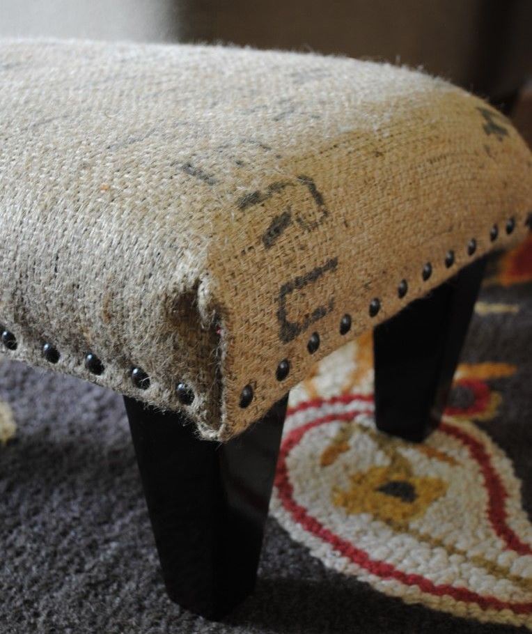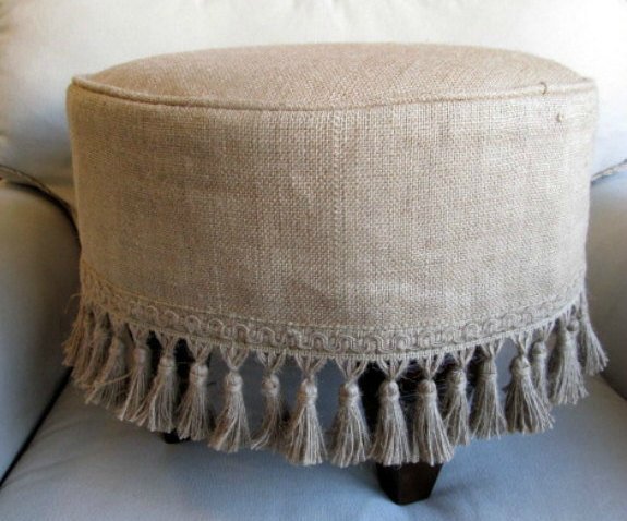 An old padded stool with a shabby upholstery will radically change if draped with burlap