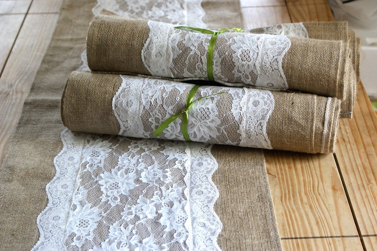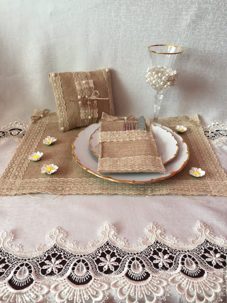 The main advantage of the material is its “unpretentiousness” in combination with other textures. A burlap with bright colors, pastel colors and exquisite prints looks harmonious. It all depends on the taste of the owners. Harmoniously, home decoration decorated with burlap will look with trimmings of lace, satin ribbons or even chains. Embroider on burlap from beads, yarn, sequins. This technology will add more charm and originality to the material. An example of a successful combination is a burlap with white lace in a classic brown interior.