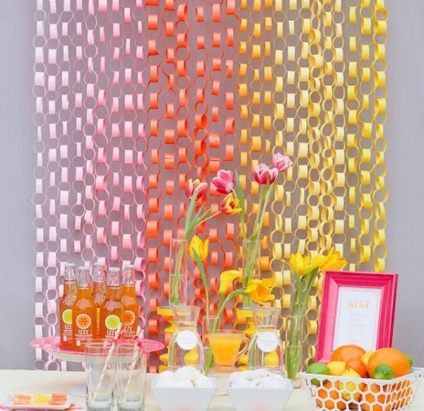 A great idea for decorating the ceiling is paper or satin ribbons diverging from the center to the edges. To complement the composition, use flowers from balloons, randomly arranged paper pompons suspended at different heights.