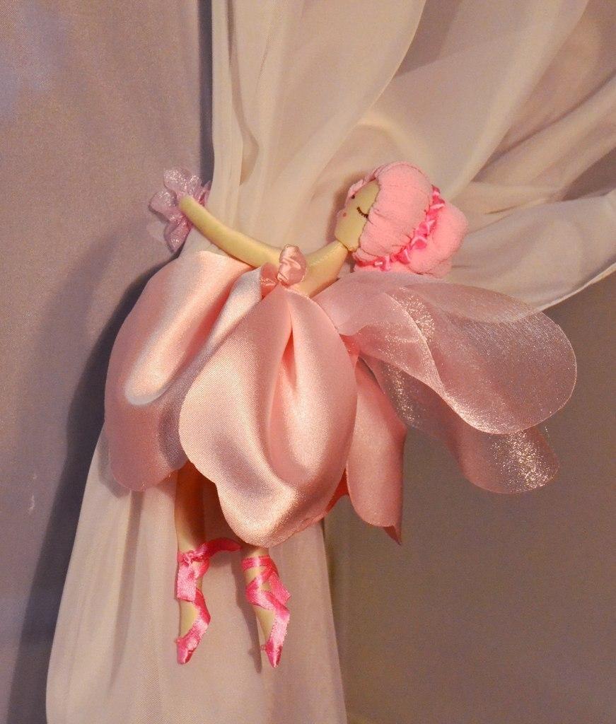 Bright decorative elements are suitable in the child’s room: garters, ribbons, laces and their combination. Cute brooches in the form of butterflies, animals, bows are attached to the surface. Soft toys used as pickups create a cheerful atmosphere.