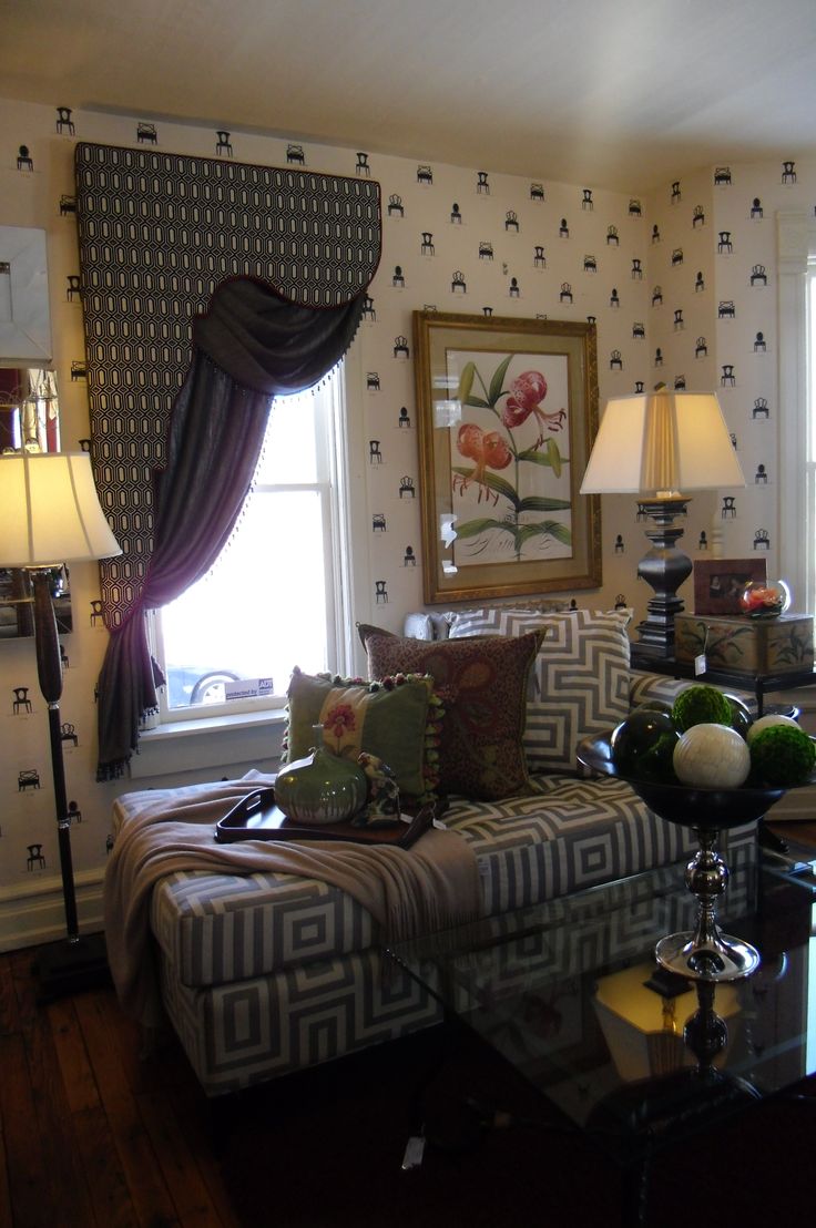 The highlight of the interior of the living room will be an interesting lambrequin with folds and additional accessories
