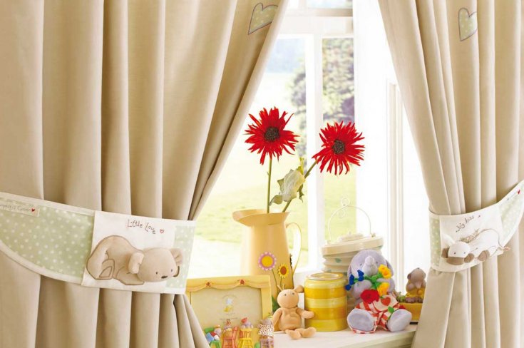 Children's room suggests the presence of bright accents in the interior. Do not use dark or dull colors. Accordingly, curtains choose light shades. Colorful curtains with children's photo printing will fit in best. Plain curtains are easy to decorate on your own and give them playfulness.