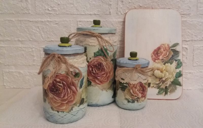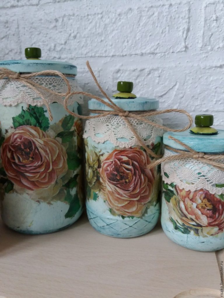 Do-it-yourself home décor is gaining in popularity. They add special charm and comfort to the room. Using various techniques, skilled needlewomen decorate bottles, flower pots, make beautiful books and kitchen shelves, walls and even ceilings. We suggest starting small and decorating the glass jar with your own hands.