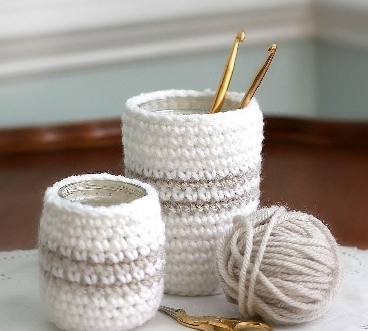 A jar tied with woolen threads can be used as a pencil box