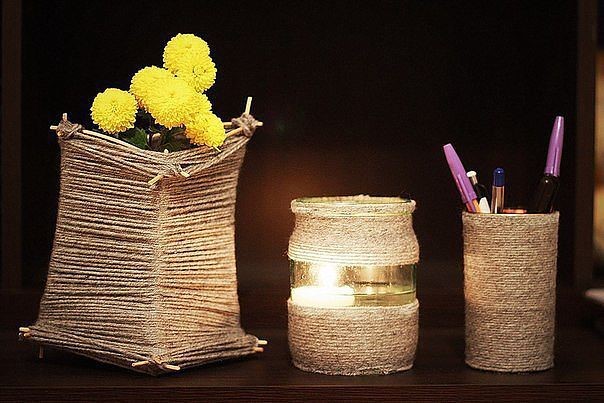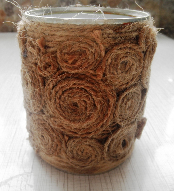 Twine is suitable for creating various patterns on the surface of a can, a kind of cover or frame. This material is similar to a vine, and is used for the same purpose.