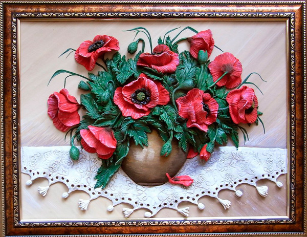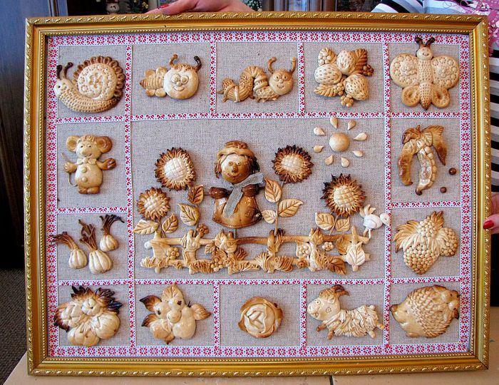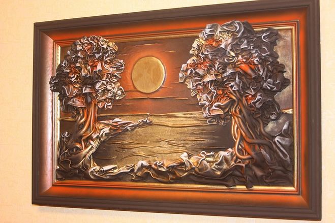 Beautiful and voluminous pictures are created from salt dough. It is easy to prepare, dries quickly, paint lays well on it and most importantly - anything is created from it. It is better to cover the finished product with colorless varnish so that it remains for a long time. It is important to think in advance how you will attach the panel to the wall - make a hole or insert a hook.