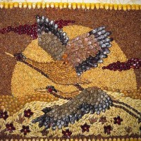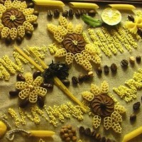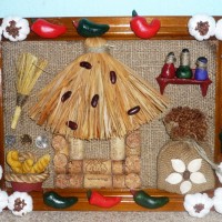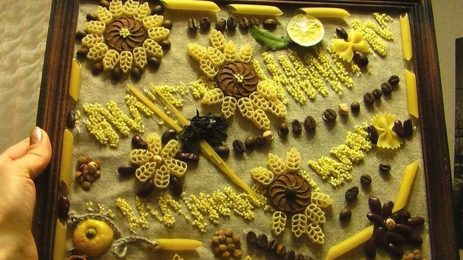 If you want to create an unusual panel, and not just a picture of pasta, then use other materials: dried fruits, spices, nuts, buttons, broken dishes, bottle caps. They are laid out in random order or adhering to the selected pattern / pattern.