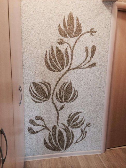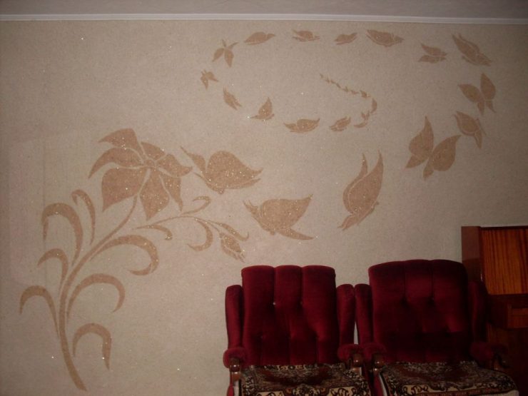 Using liquid wallpaper you can create various patterns and reliefs. To do this, you can create a stencil, attach it to the wall. Then draw the background, the contours of the element and align the edges. After the final drying, remove the sketches. Then we fill the formed place with a different color or texture.