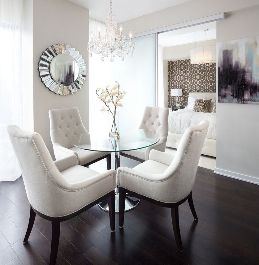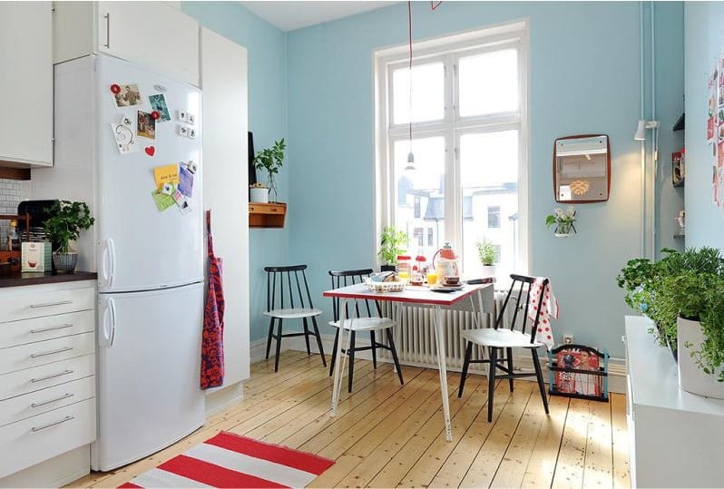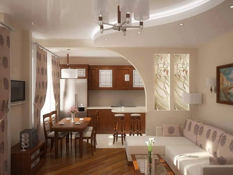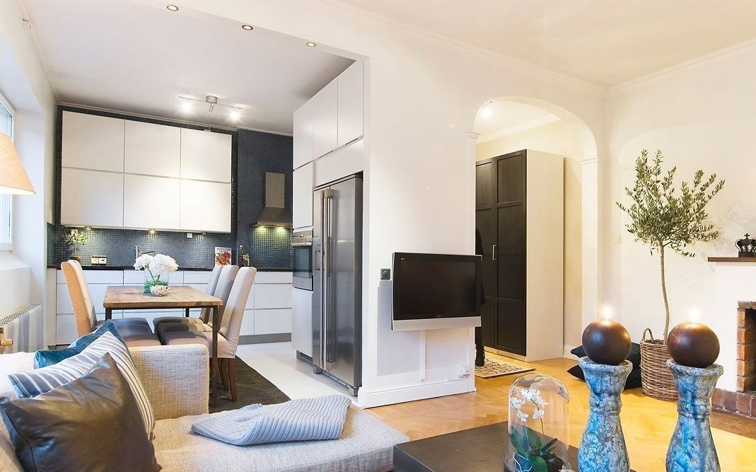 Si la cuisine et la pièce sont séparées par une cloison lumineuse, vous pouvez combiner les pièces et organiser un confortable salon-cuisine dans lequel il y a une place pour une grande table à manger