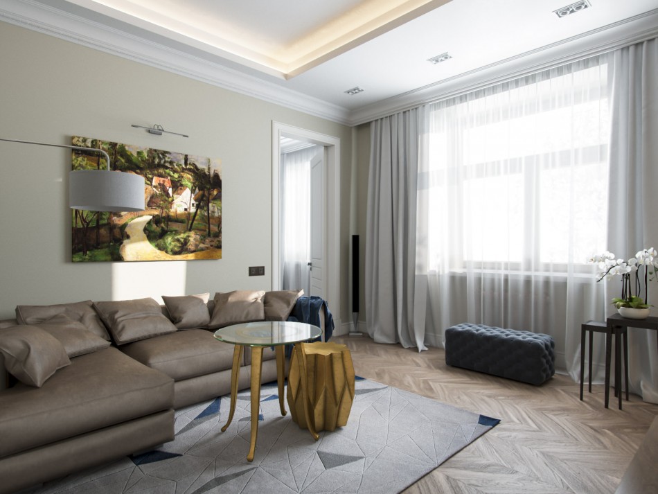 Le projet de conception est inspiré par la nostalgie de l'obsession des pores des vacances d'été. Convient aux amateurs de reflets du soleil dans la conception d'un appartement de 3 pièces de 60 à 70 m² ou d'un aménagement spacieux de deux pièces. Les tons nobles créent une atmosphère particulière d’hospitalité, d’affection et de soins. Les notes modernes ajouteront un bar, un fauteuil poire et une suite blanche.