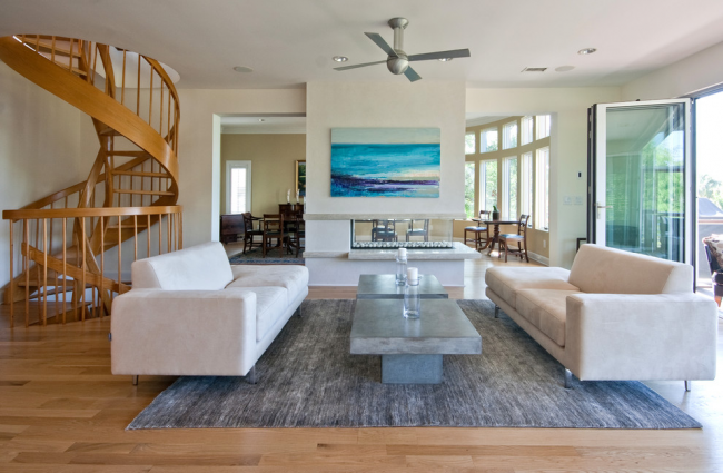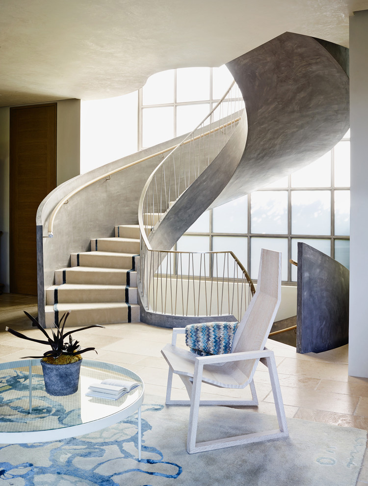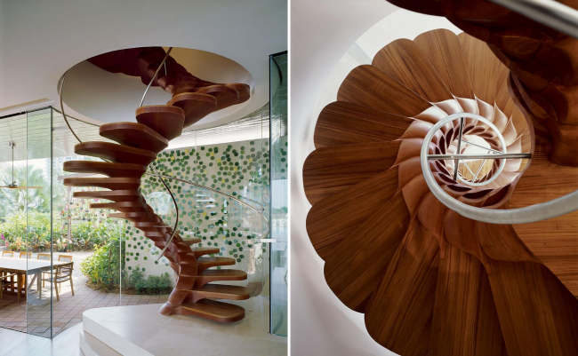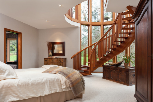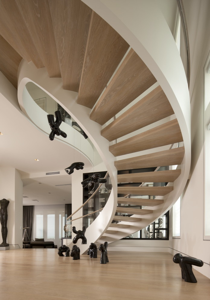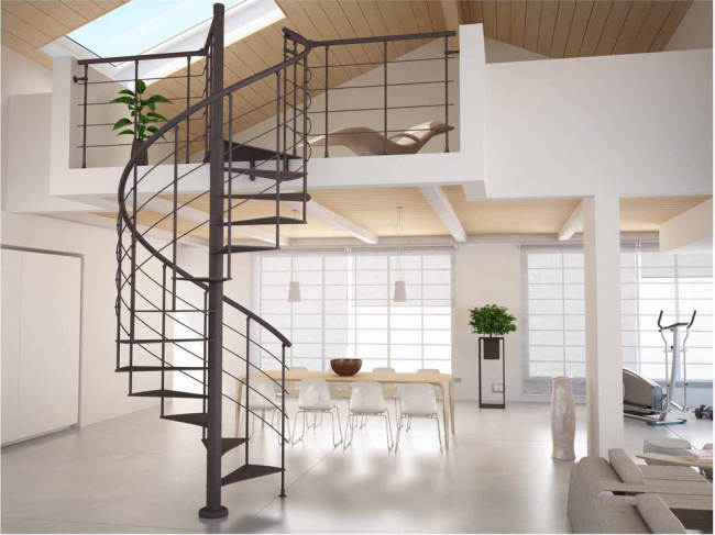 Semble spectaculaire escalierayant une base incurvée. Ses formes fluides se combinent avec l'intérieur. Les marches il est attaché au centre de la base. Par conséquent, il ne ressemble pas à visser. Doit y avoir garde-corps. Surtout quand il y a des personnes âgées et des enfants à la maison.