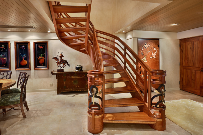 Escalier de naturel matériaux S'intègre parfaitement dans le style écologique. De plus, tous ses éléments devraient être exclusivement en bois. La présence de motifs sculptés sur constructions ajustement ethno-style. La balustrade en bambou complétera parfaitementsalle en forme à la japonaise. Construction les formes brutes s'inscrivent dans la direction du pays. La Provence prévoit la disposition des blancs les installations. Vous pouvez souligner son élégance avec des éléments forgés ou sculptés.