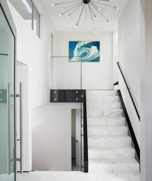 Si l'intérieur exécuté dans une direction minimaliste, il ne vaut pas la peine d'utiliser des détails supplémentaires. Tout construction Cela devrait être presque invisible. Ceci s'applique également aux escaliers. Il convient de le publier garde-corps de transparent matérielpar exemple, le plexiglas.