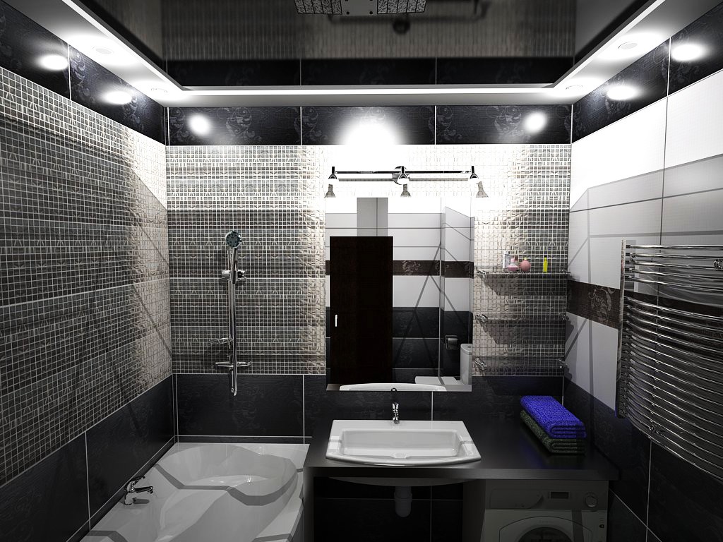 Votre journée commence à partir de cette salle et se termine ici. La tâche principale à l'intérieur de la salle de bain est de créer une atmosphère de calme, de confort et de confort. Le plafond noir associé à un carrelage sombre, nécessairement dilué avec du blanc, sera organique du fait que le premier résistera à l'humidité, il sera facile de passer par la procédure de nettoyage. - Plafond noir dans la chambre.