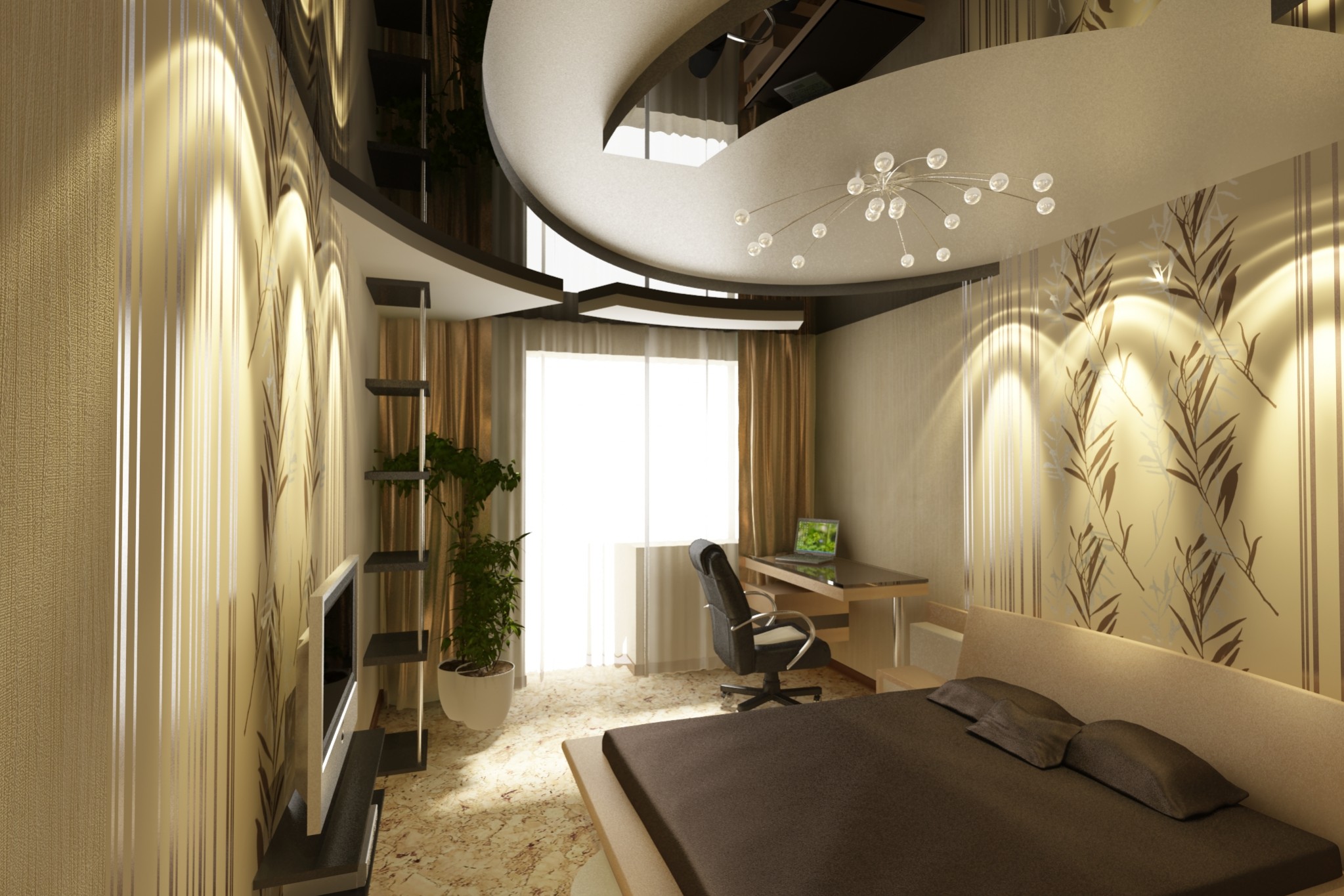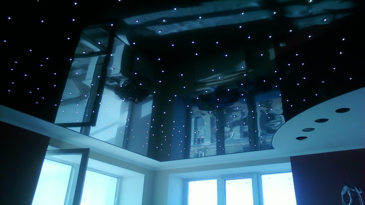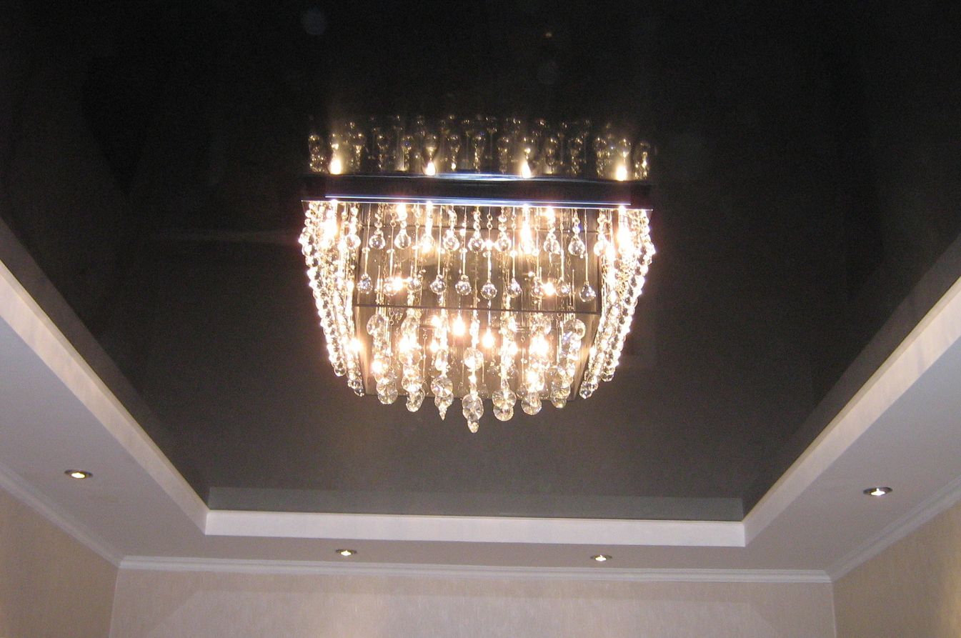 Le plafond noir à l'intérieur s'efforce souvent de décorer avec des projecteurs, ce qui est une erreur en raison de la dilution de la lumière, de l'effet absorbant. Plafond noir aura l'air mieux avec un lustre dimensionnel. Il est important de savoir que les lampes de cette conception doivent être achetées avec une puissance accrue.