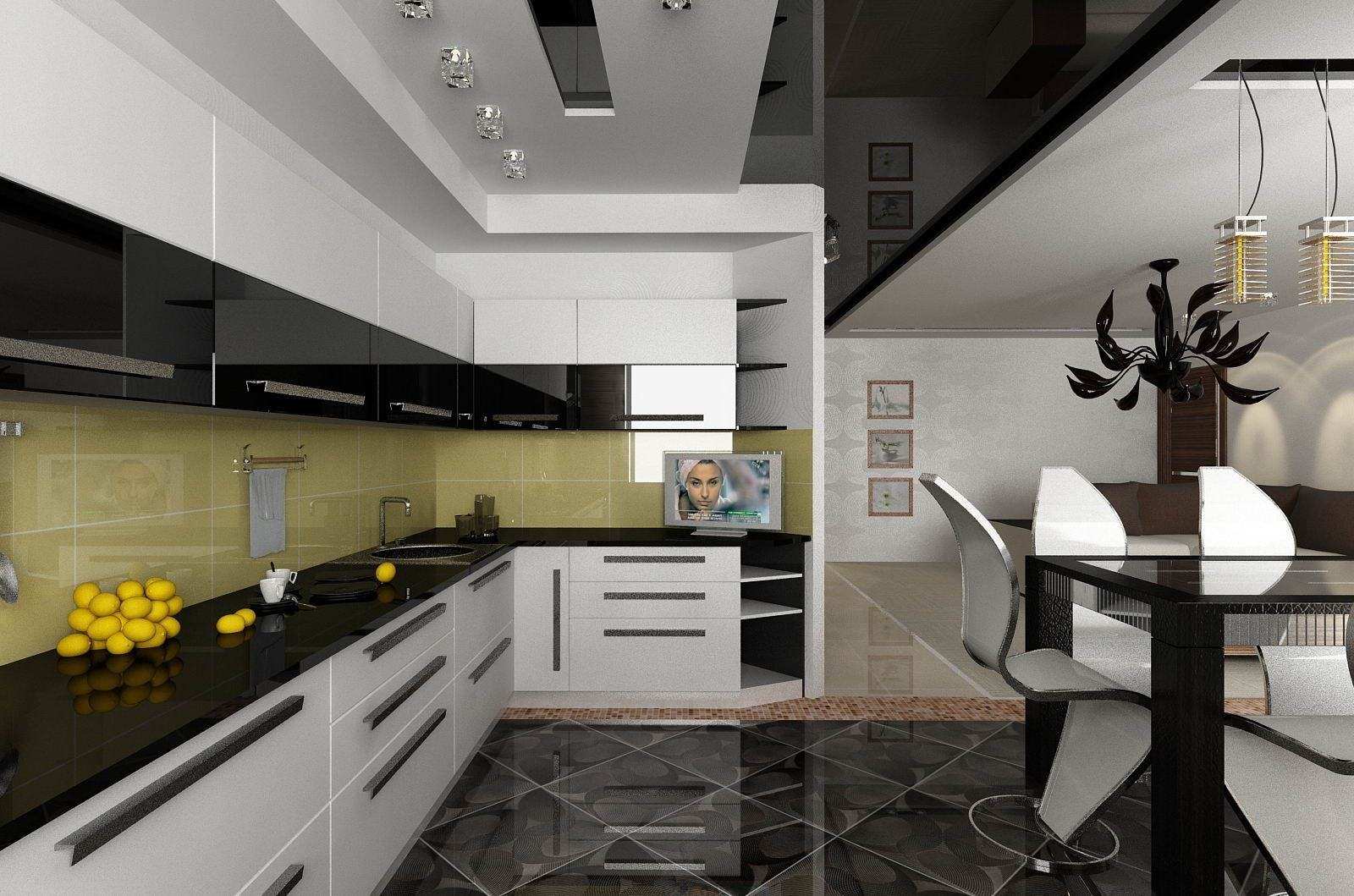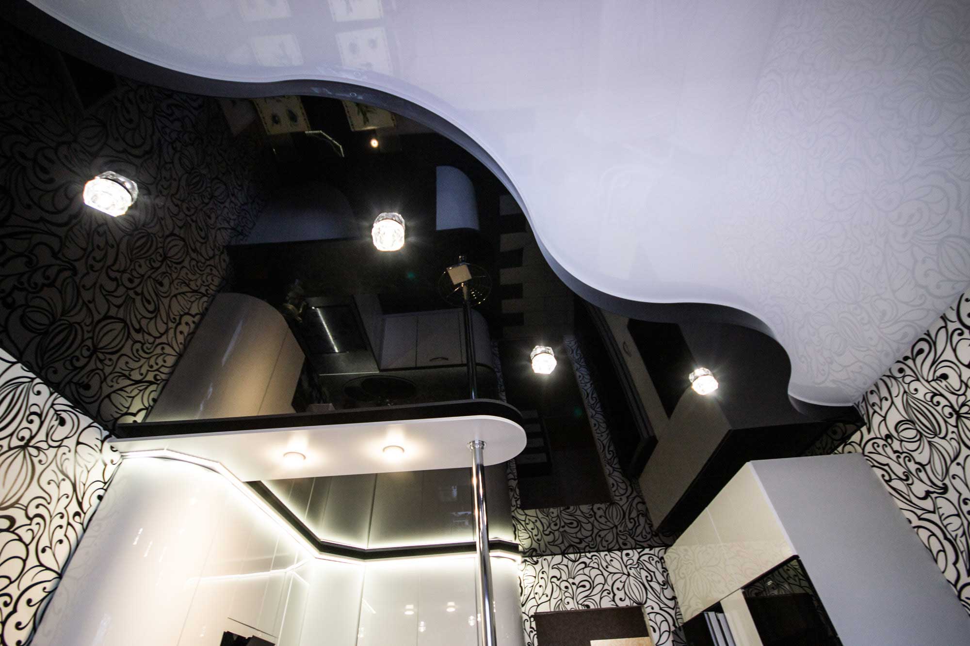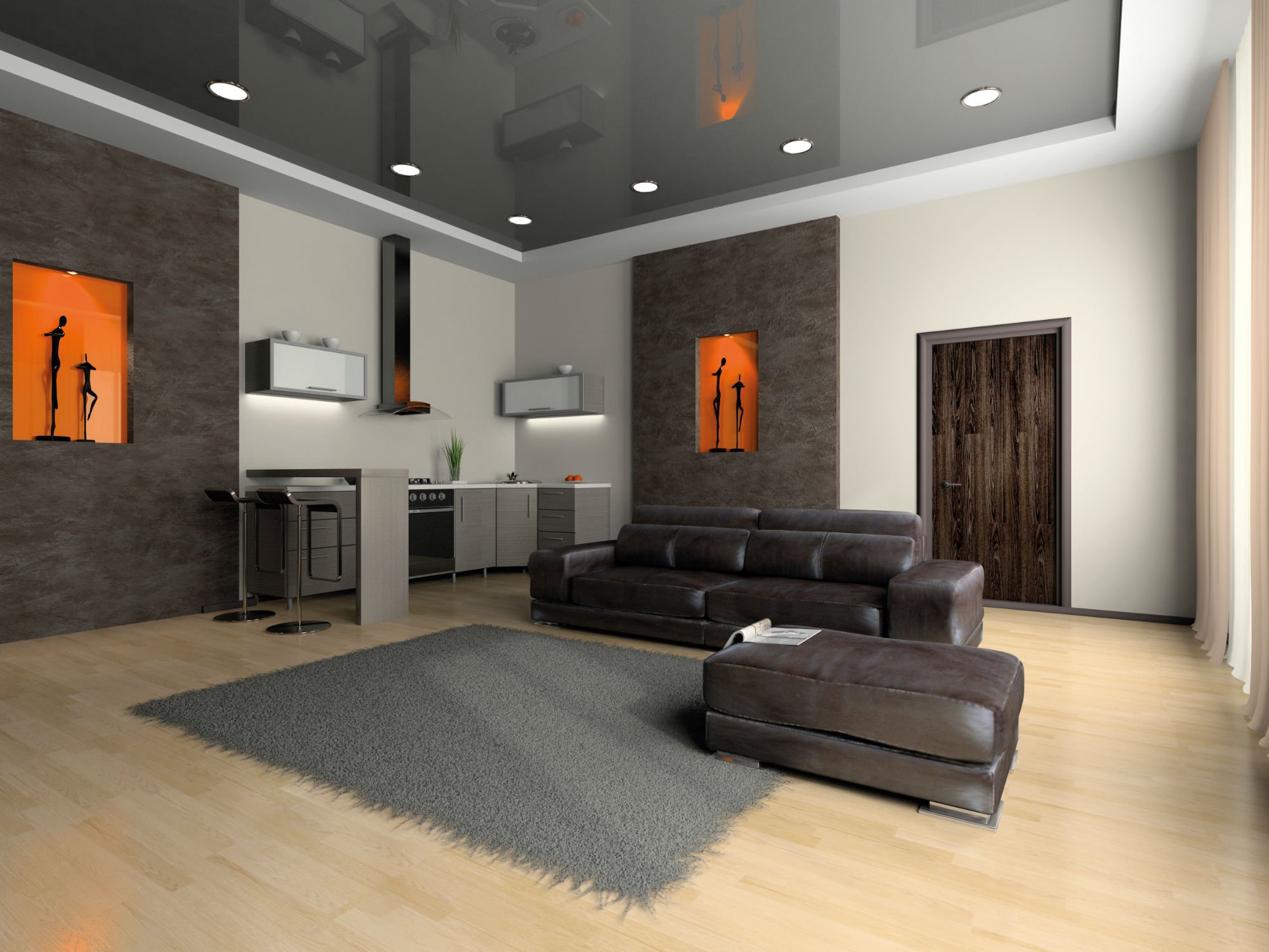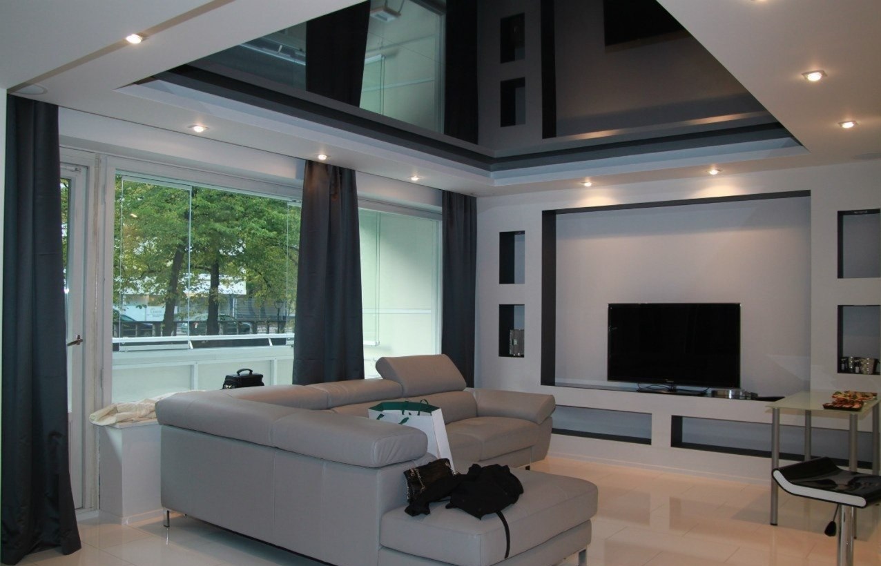 Si vous décidez de concevoir une cuisine avec un plafond tendu noir, cette option est tout à fait appropriée. Le battre correctement pour aider les meubles minimalistes. Évitez les accessoires brillants, massifs et accrocheurs, afin de ne pas violer le concept général de l'ambiance de l'intérieur de la cuisine. - Salon et plafond noir.