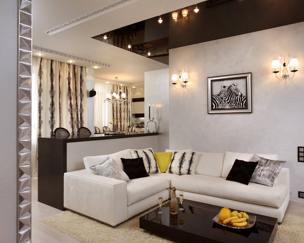 Le plafond noir à l'intérieur du salon doit être battu dans le style choisi. Ce peut être le minimalisme, la haute technologie, moderne, militaire. Si vous concevez dans un style rustique, shabby chic, classique, ces décisions de conception à l’intérieur sembleront tout à fait inappropriées. Pour que les pièces présentant une solution telle que les plafonds noirs et les murs blancs aient un aspect plus original et de grande qualité, les experts recommandent de compléter la couleur avec des détails et des accessoires lumineux.