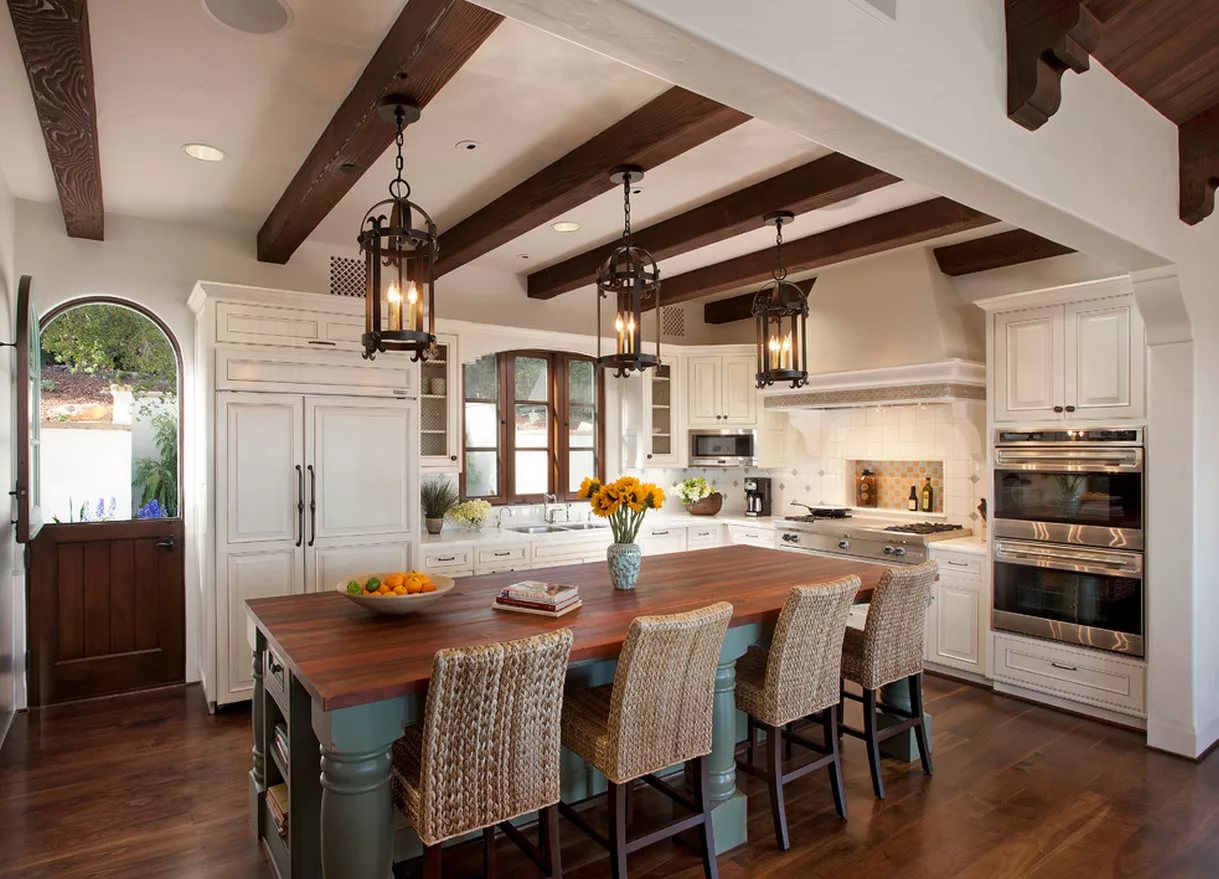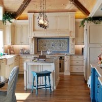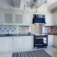 Une option gagnant-gagnant pour ceux qui préfèrent un motif espagnol, scandinave ou méditerranéen. Il n’est pas du tout nécessaire de forcer toute la cuisine à devenir des objets d’art, vous pouvez vous concentrer sur une certaine partie. Il peut s'agir d'une table ou de poignées d'armoires.
