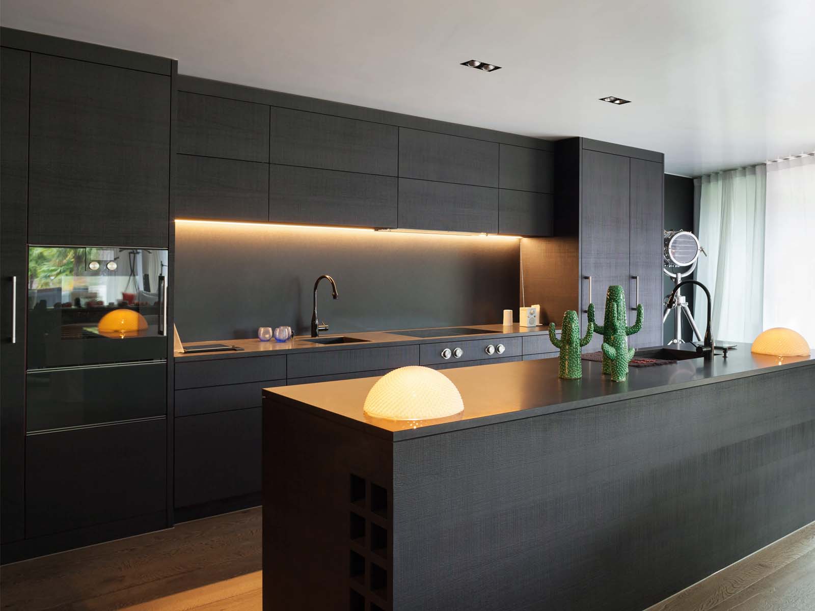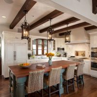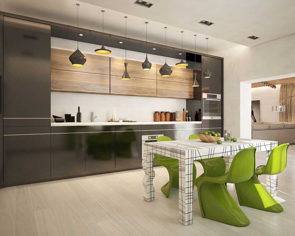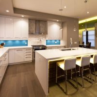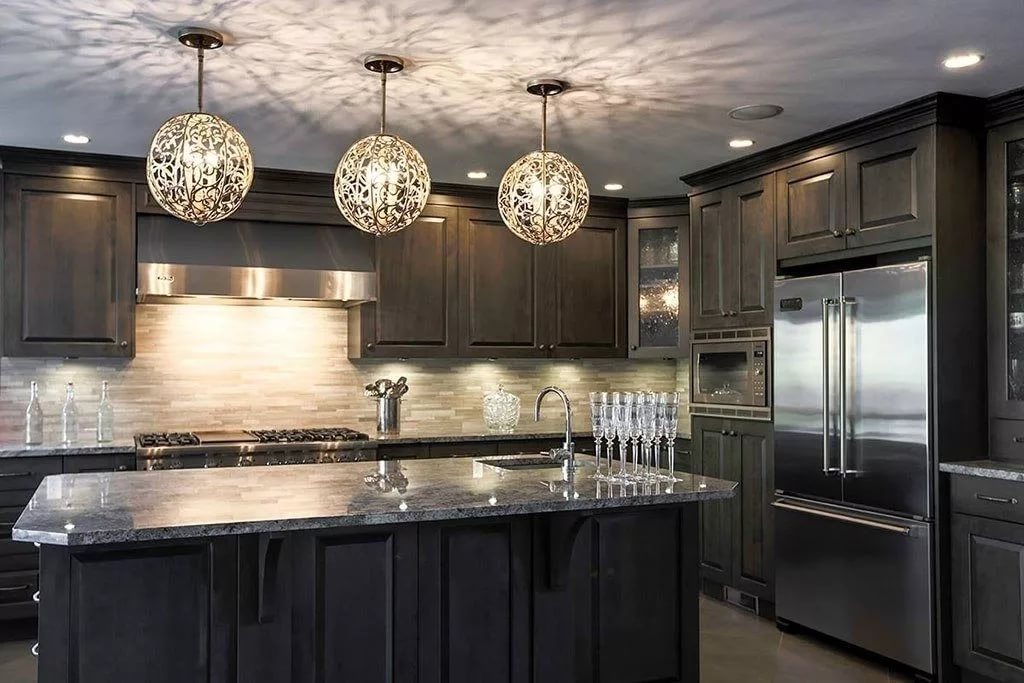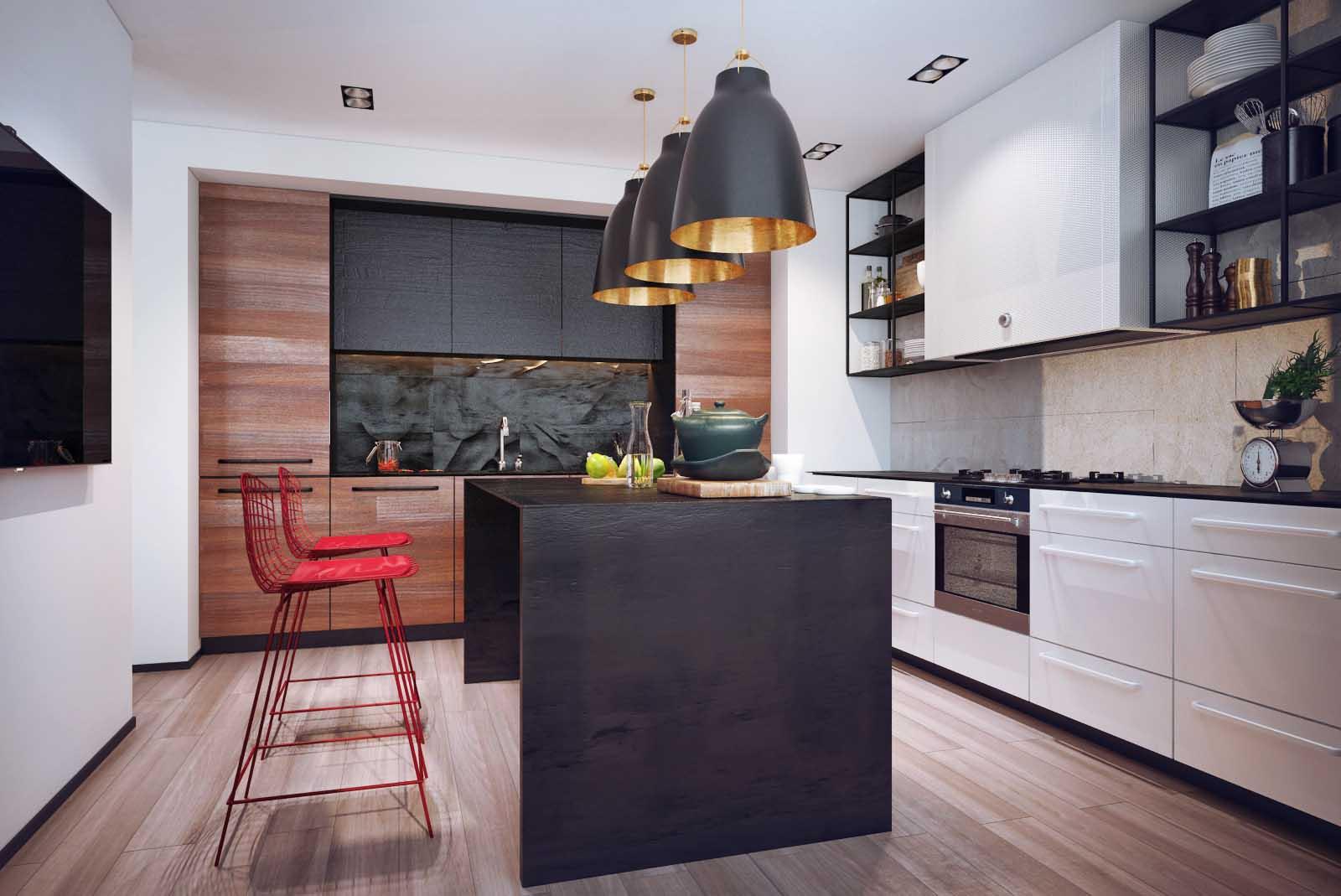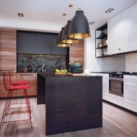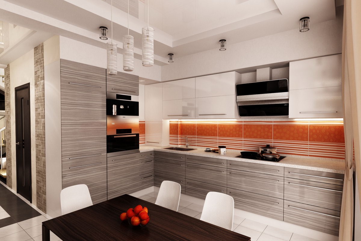1. Si la cuisine est faite dans des couleurs sombres, il est conseillé d’éclairer les lieux de travail non seulement, mais aussi de le compléter, afin de procurer un confort optimal à toutes les personnes présentes. Il est important de se rappeler que 20 à 30 watts sont mis par mètre carré.