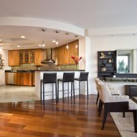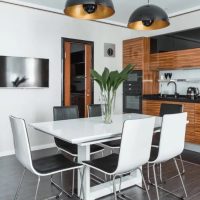 Le zonage fournit le plus souvent une transition en douceur dans le style ou les nuances. Par exemple, la zone de travail où la cuisine a lieu peut être rendue plus lumineuse. Mais pour la réception, vous pouvez même utiliser un éclairage diffus utilisant des lampes rétro, etc.