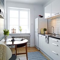 Au fait! Dans une cuisine complètement blanche, même les articles les plus volumineux sont beaucoup plus faciles à ressentir. Par conséquent, vous pouvez choisir en toute sécurité un réfrigérateur ou un four spacieux.