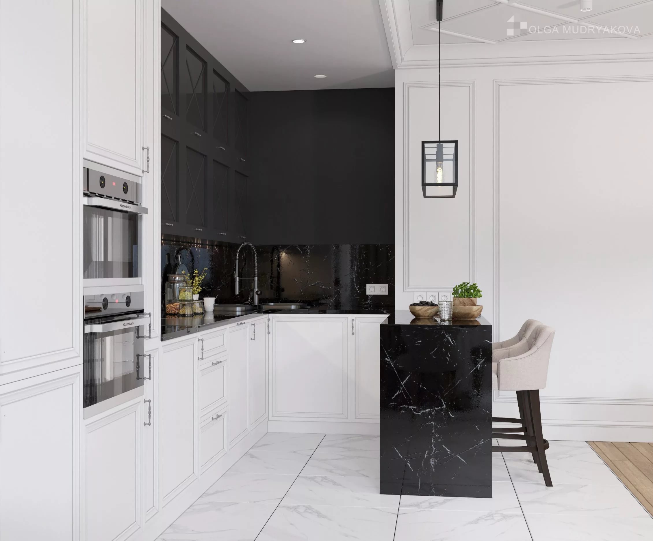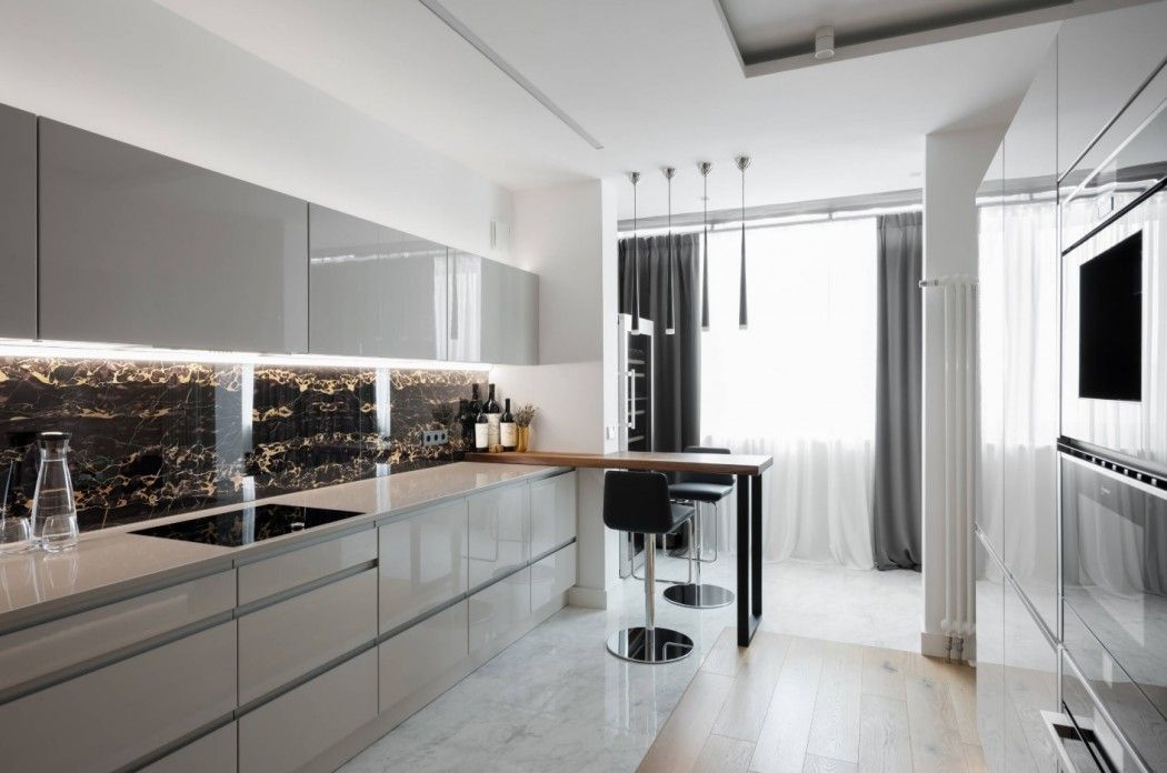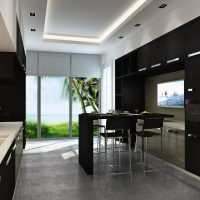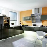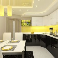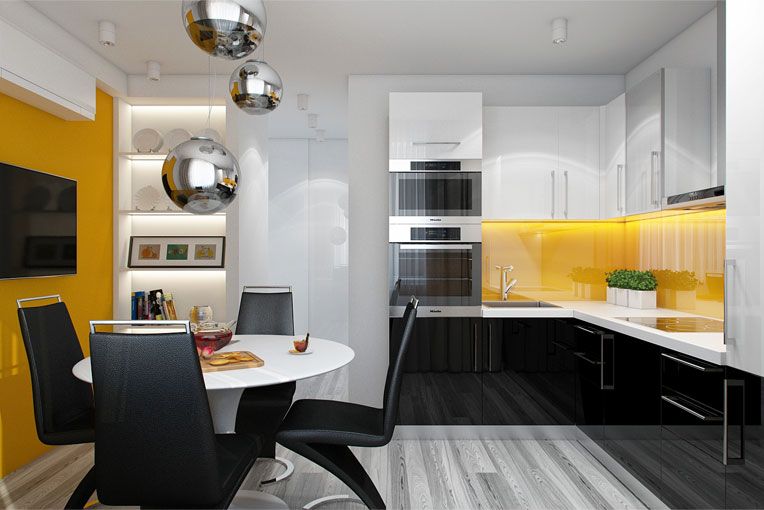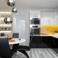 5. Cuisine noire et blanche - il est souhaitable que les murs restent blancs. Il est conseillé d'ajouter des nuances noires dans un dosage sous la forme d'un intérieur d'auteur.