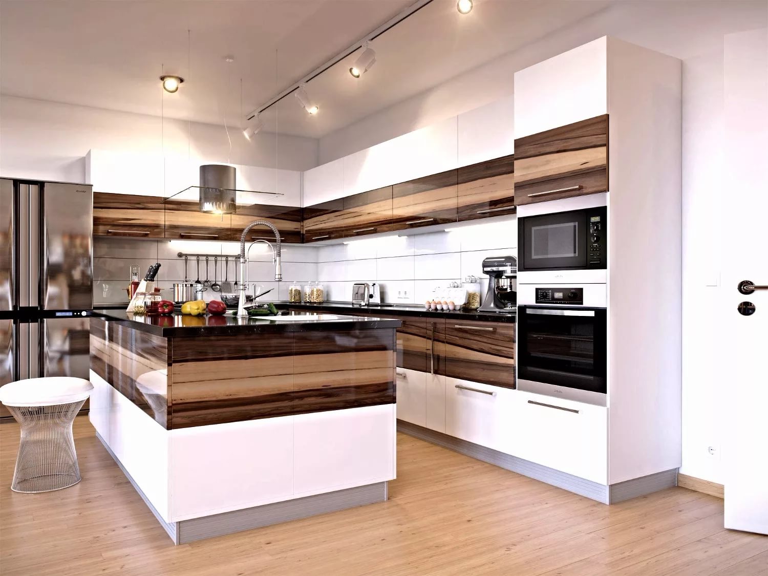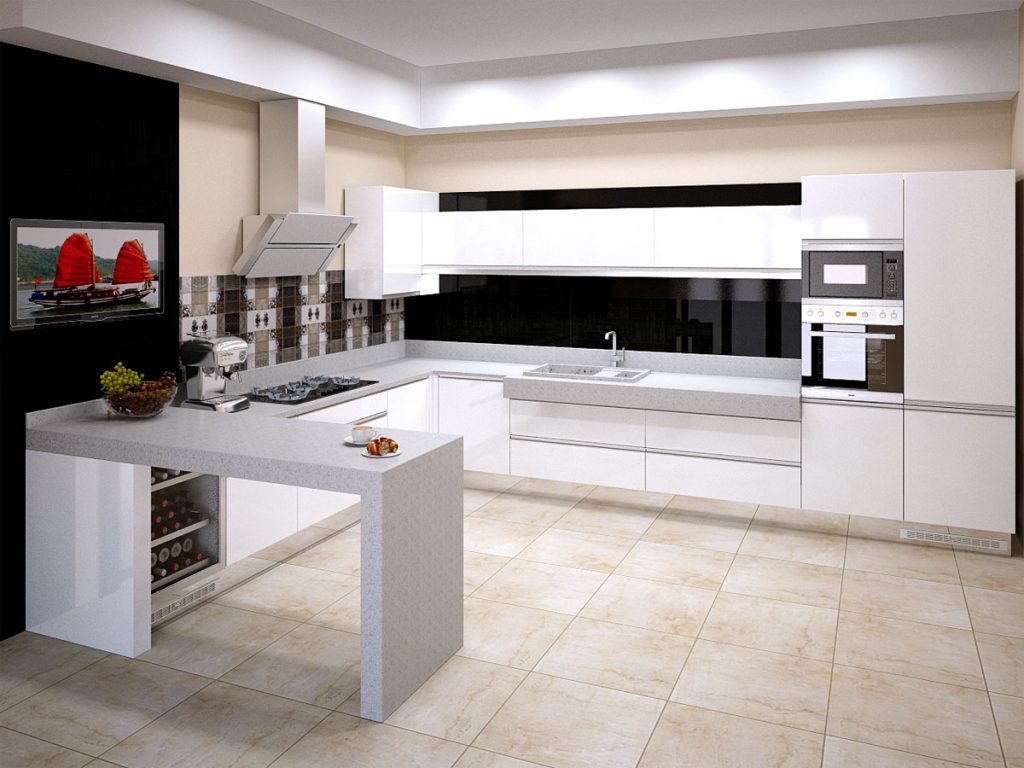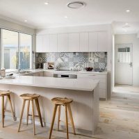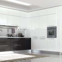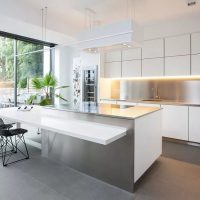 Métallisé est parfait pour une cuisine entièrement blanche. Les rayures, la poussière et les taches seront moins visibles. Il est conseillé de choisir une technique de conception mate, car il est beaucoup plus facile d’en prendre soin.