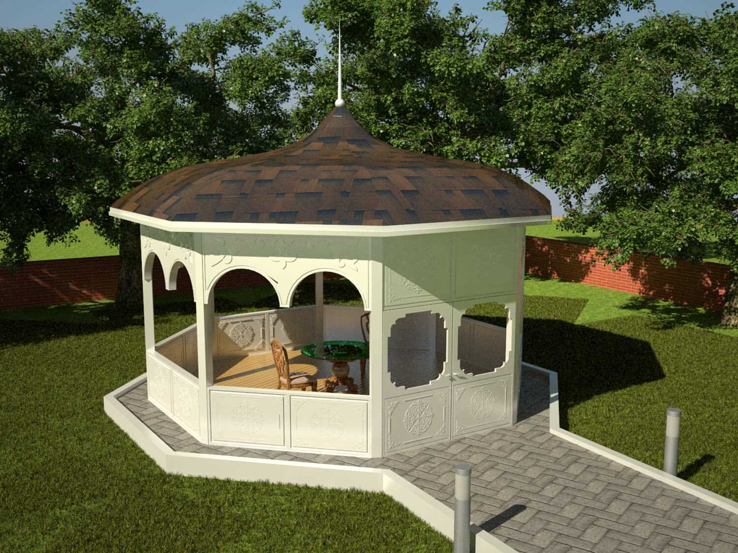 Option sans textile - sous le toit, des inserts sculptés ou des grilles peuvent être fabriqués pour ajouter de l'ombre et un décor luxueux. Au centre du belvédère, s’il n’ya pas de fontaine, il est pratique de mettre une table. Il existe une option pour changer le remplissage de la structure - dessus de table pliant et mobilier de jardin clair.