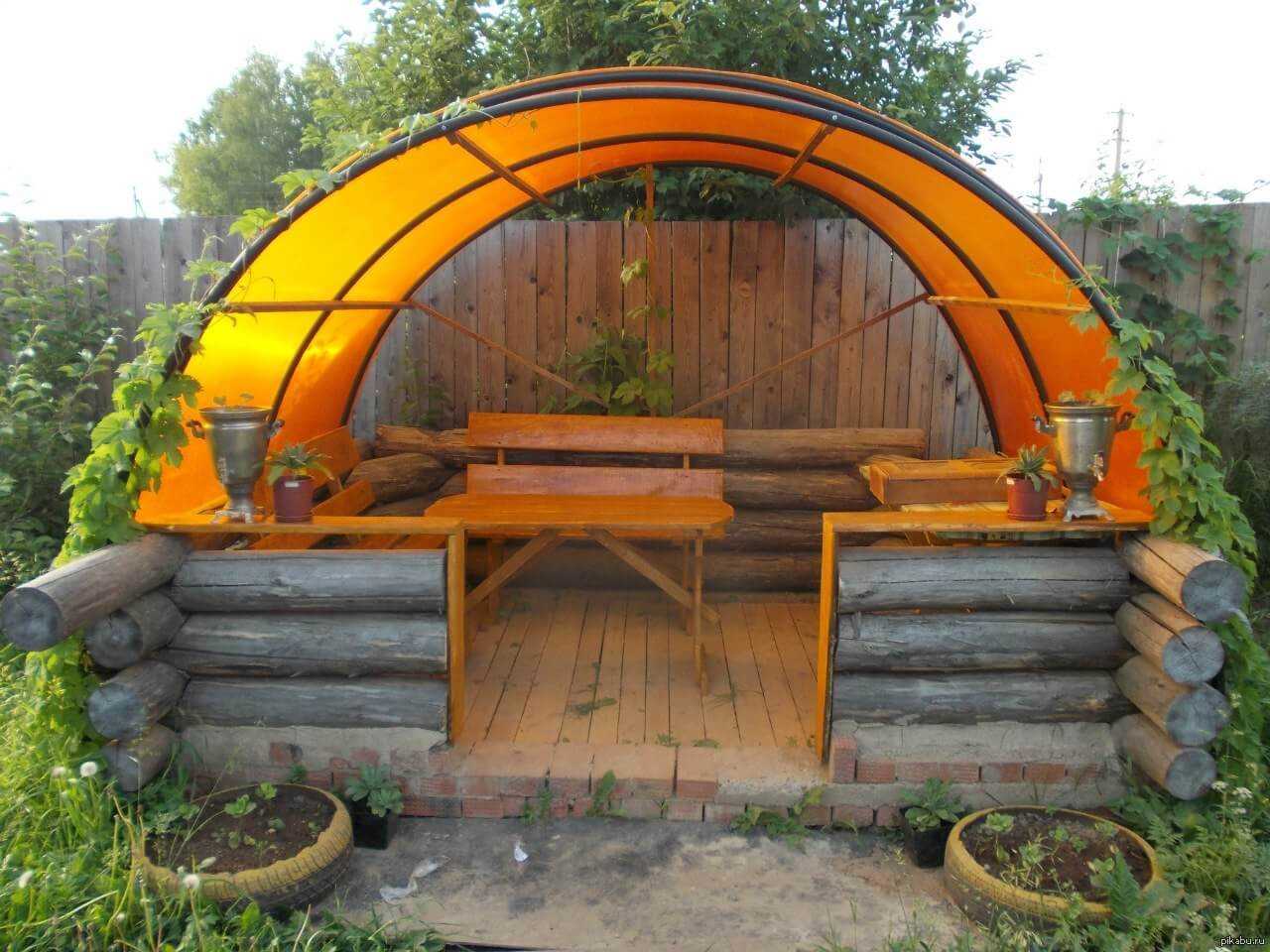 Pics, gouttières, baldaquins, rotondes, galeries couvertes - constructions paysannes faciles. Ils se transforment facilement en allées si des meubles en osier de jardin ou des chaises en plastique sont disposés. La toile de fond du côté sud est facile à organiser avec de vieux stores ou une bâche.