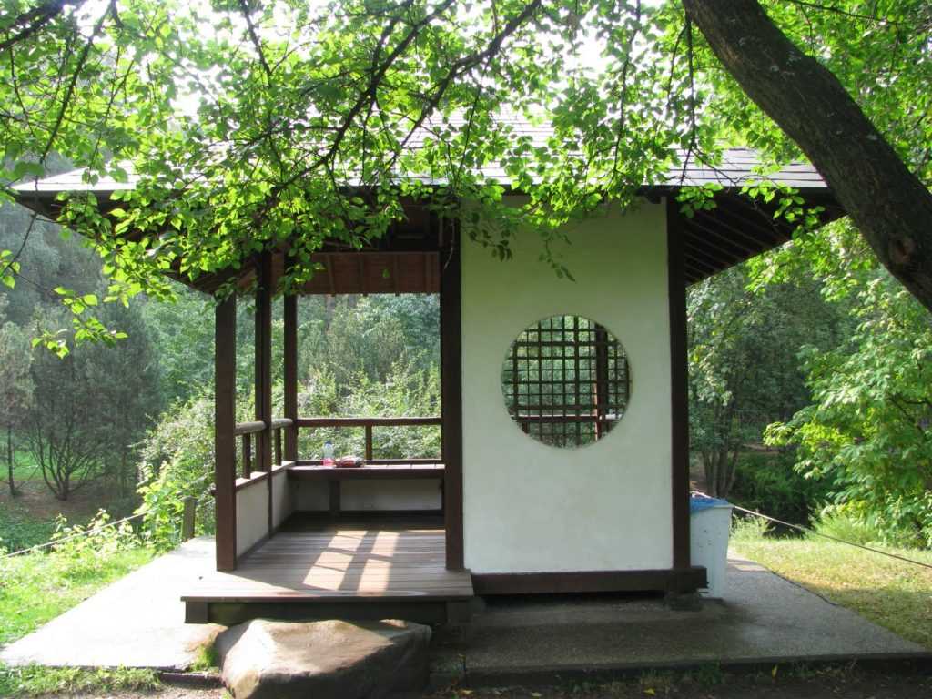 Dans un bâtiment spacieux, vous pouvez même organiser une petite oasis de style oriental. Au centre du gazebo octogonal se trouve une petite fontaine avec du poisson dans le réservoir. Les panneaux drapés en tissu de matelas sont un excellent abri contre la chaleur estivale pour ceux qui sont assis sur des bancs avec des sièges confortables le long des cloisons du belvédère.