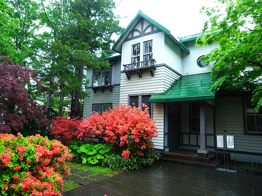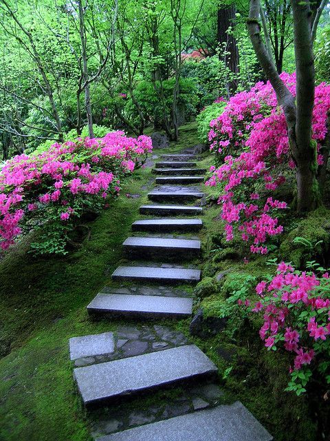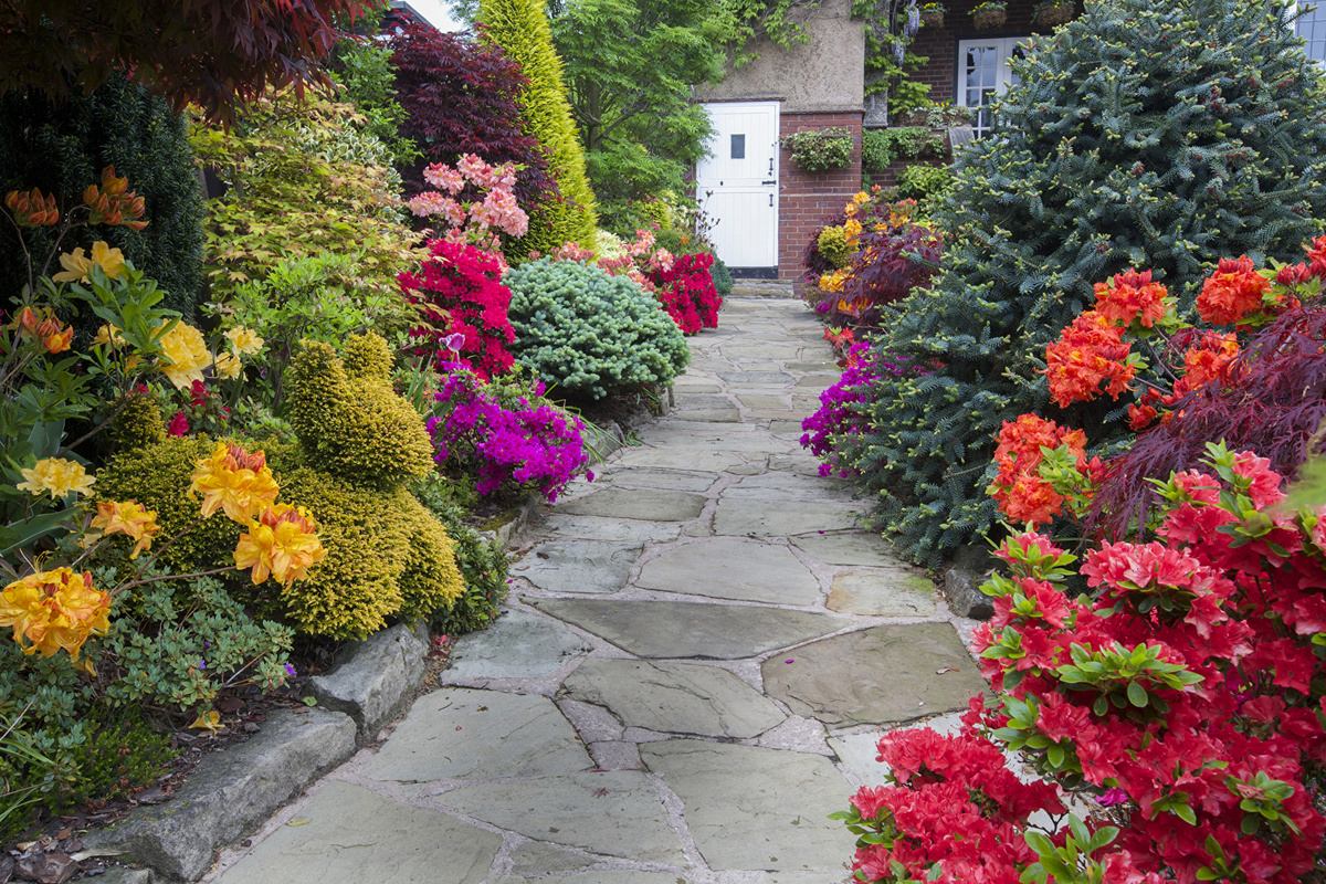 Azalée et Rhododendrons devant la porte d'une maison privée