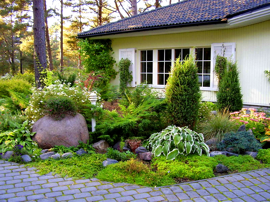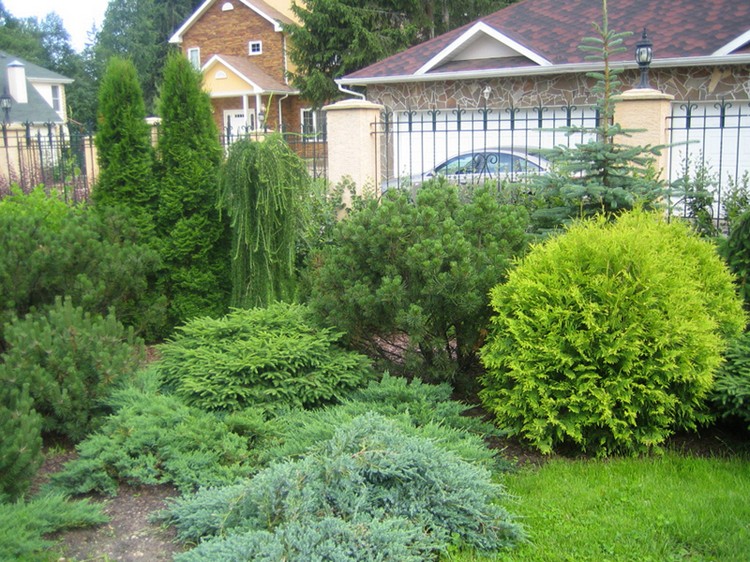- Diverses combinaisons de variétés de conifères et d'arbustes. Dans un palier, épinette, genévrier et thuya avec aubépine, myrtille et myrte sont merveilleusement combinés.