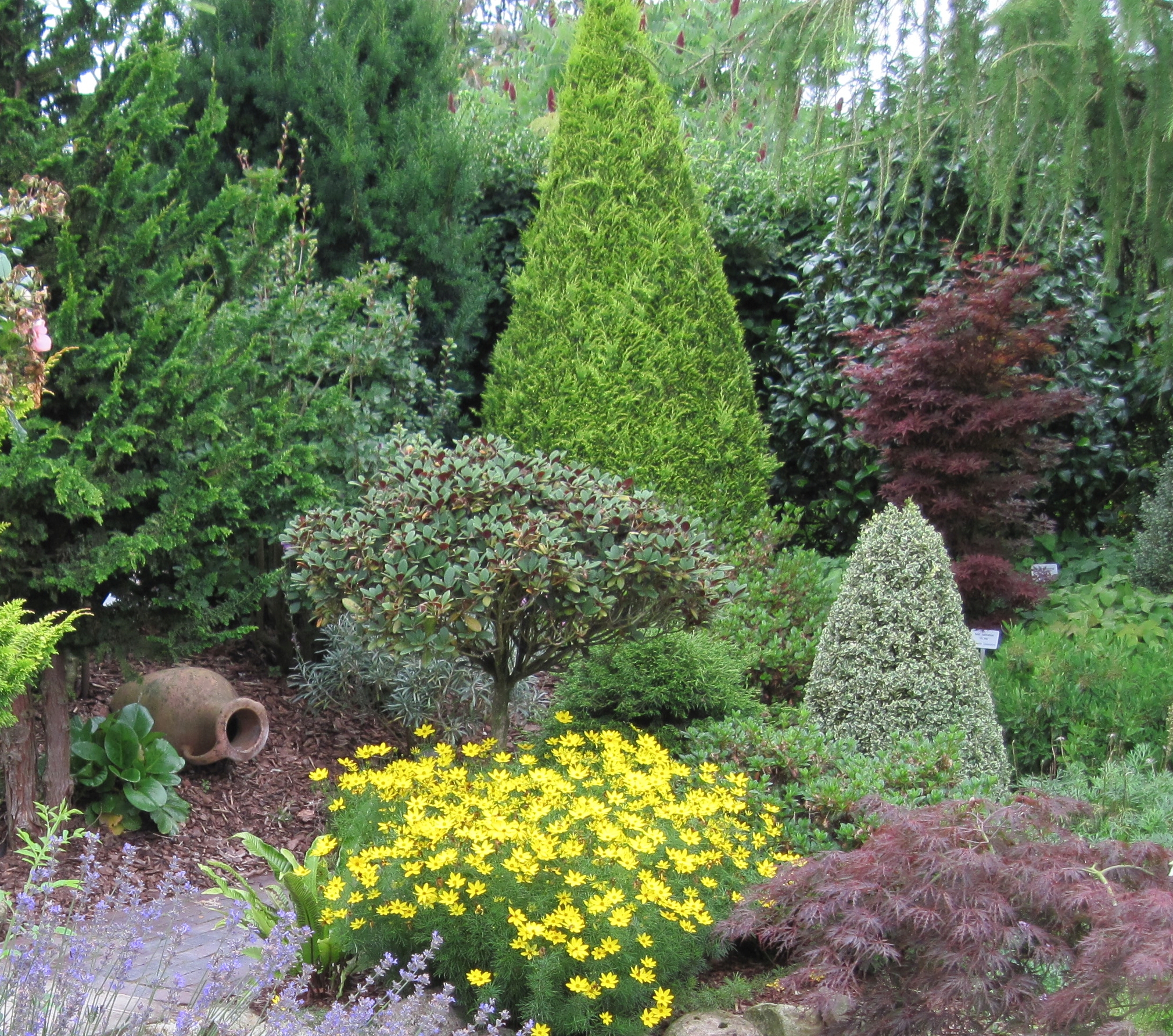Composition de jardin mixte d'arbustes résineux et feuillus